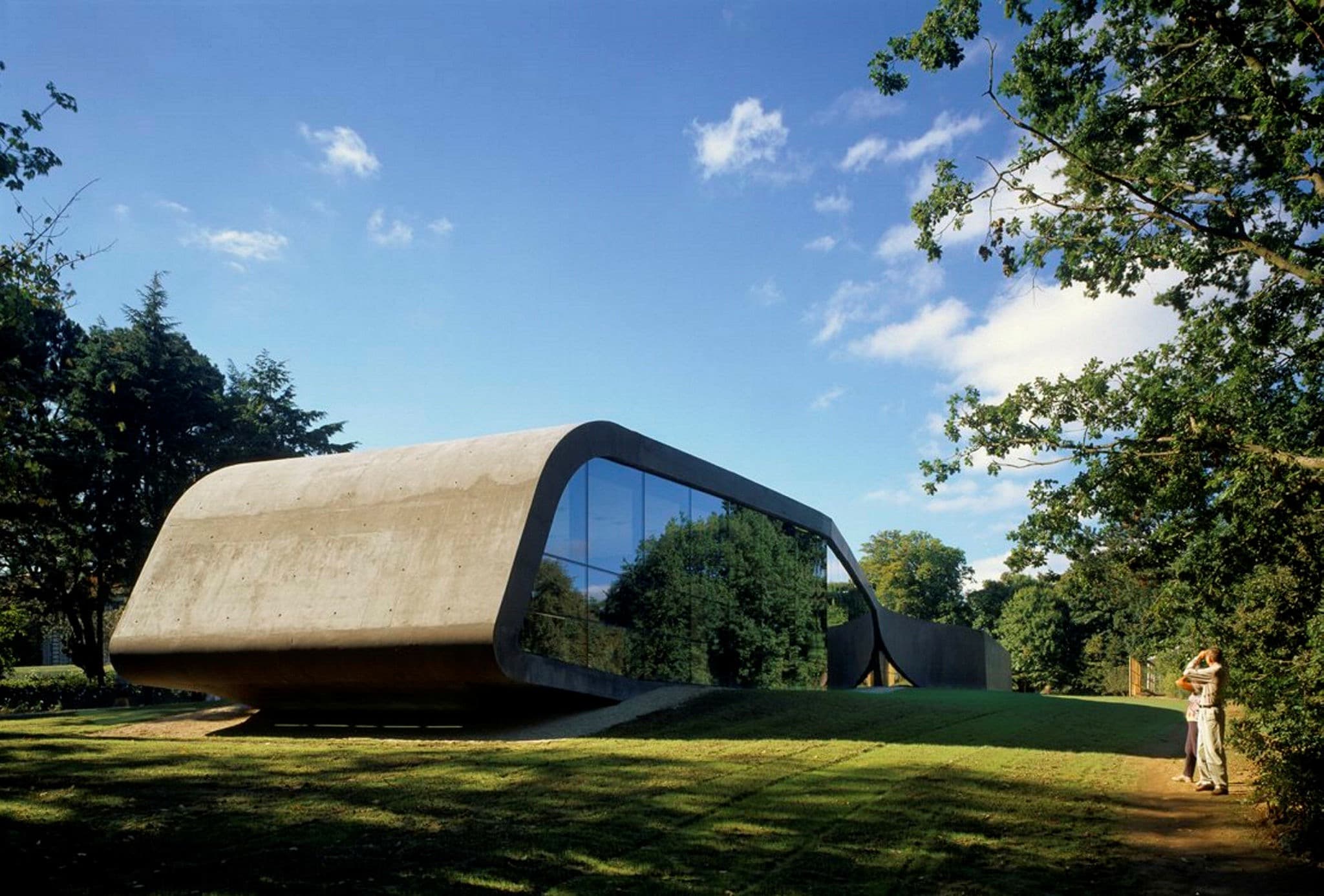 Kendetegnende for bygningen er spillet mellem den massive, mørke og afgrænsede lavabeton over for lette og gennemsigtige glaspartier, der bryder med den klare afgrænsning mellem bygning og landskab.