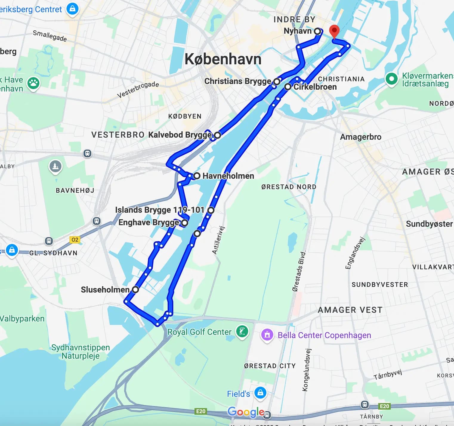 Rute: Nyhavn, Christians Brygge, Kalvebod Brygge, Havneholmen, Enghave Brygge, Sluseholmen, Islands Brygge, Cirkelbroen, Inderhavnsbroen