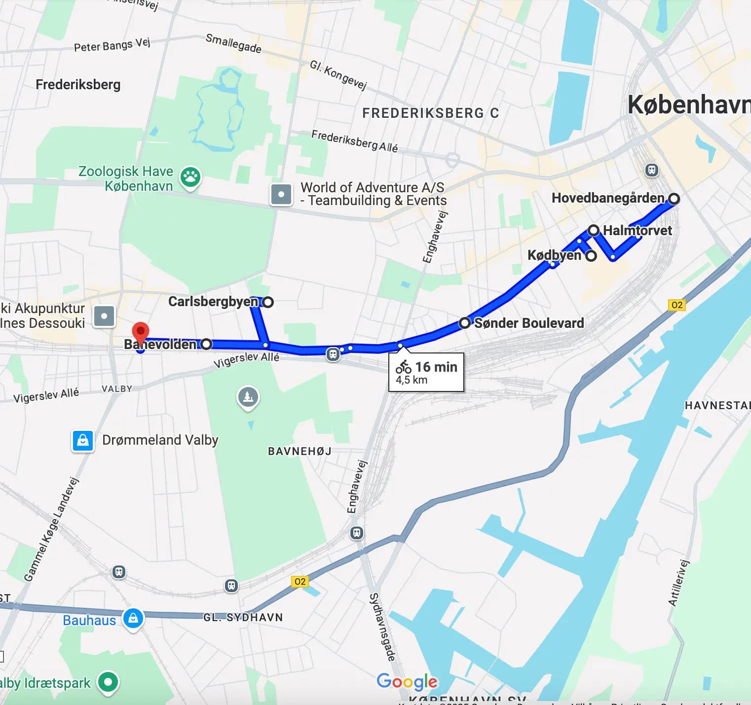 Rute: Københavns Hovedbanegård, Halmtorvet, Kødbyen, Sønder Boulevard, Carlsberg Byen, Bandevolden, Hønsebroen