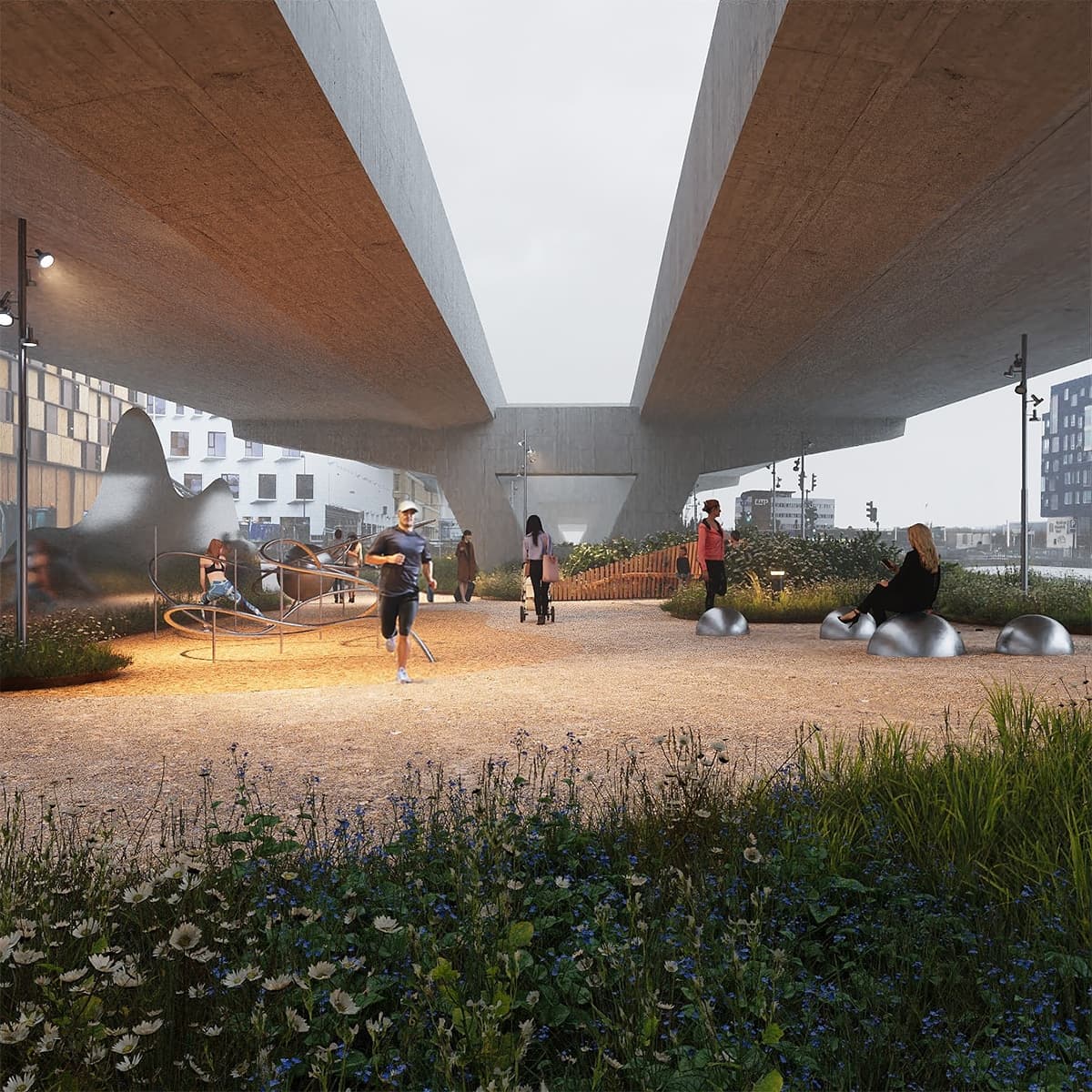 Det grønne byrum i Nordhavn åbner sig op under metroens højbane, der med sin konstruktion skaber et rum med ly og læ. I bløde buer slynger træopholdsmøbler sig, hvor man kan sidde og flyde sammen med andre. Pladsen er indrettet med skulpturelle elementer, der kan beundres eller bruges til balance og leg. Et stort, organisk formet spejl, reflekterer bevægelser, rytmik og øvelser samtidig med, at det afskærmer og afspejler omgivelserne.