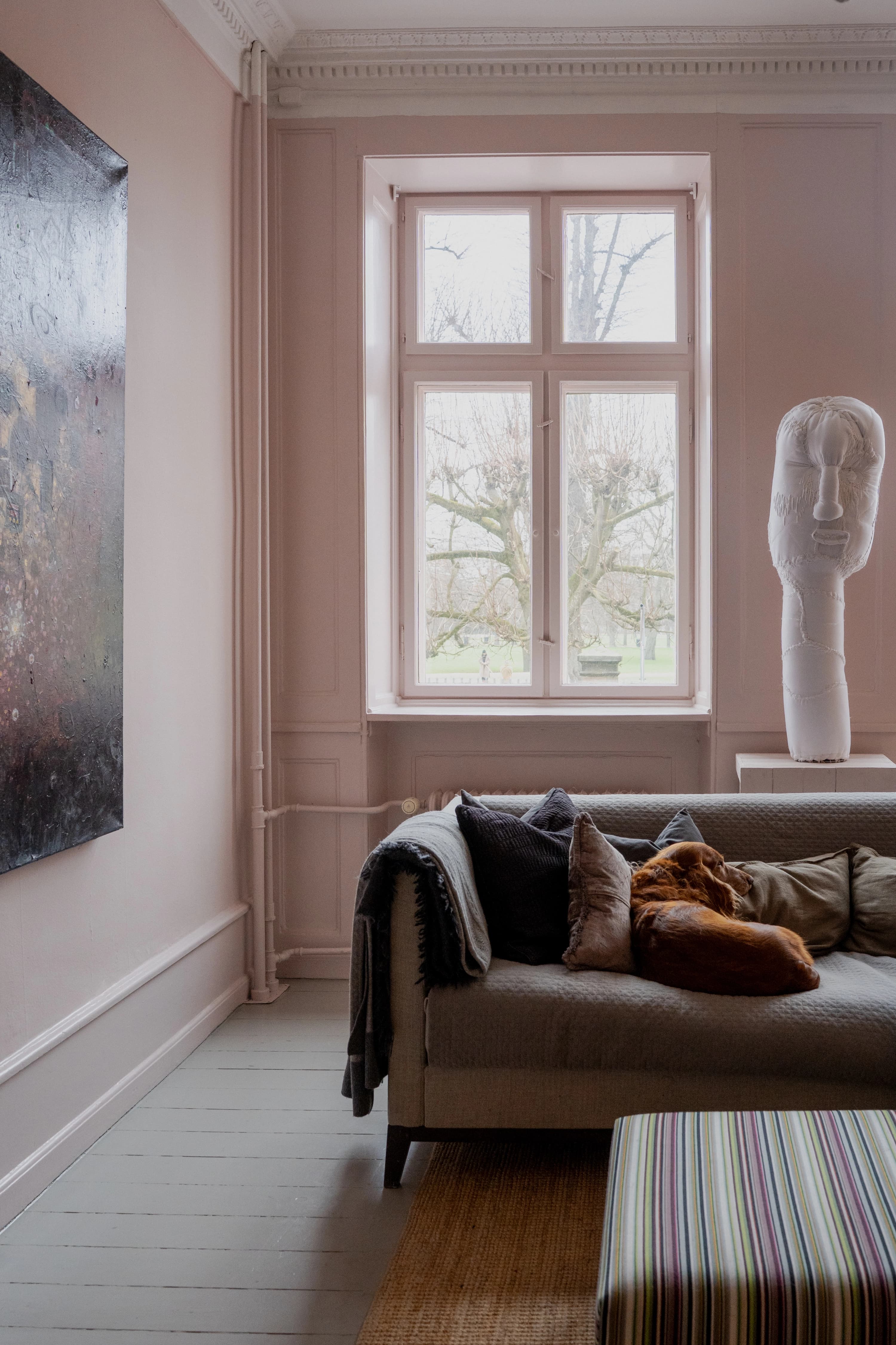 Anders ligger og holder øje med os fra sofaen foran vinduerne i den rosa stue, hvor paneler og stuk står velbevaret med deres originale detaljer. Sofaen er 30 år gammel og er udover sengen, de eneste møbler i lejligheden som Shane har købt fra ny. Han foretrækker at købe brugt og renovere frem for at udskifte – og sofaen står da også snart for tur til en ombetrækning.