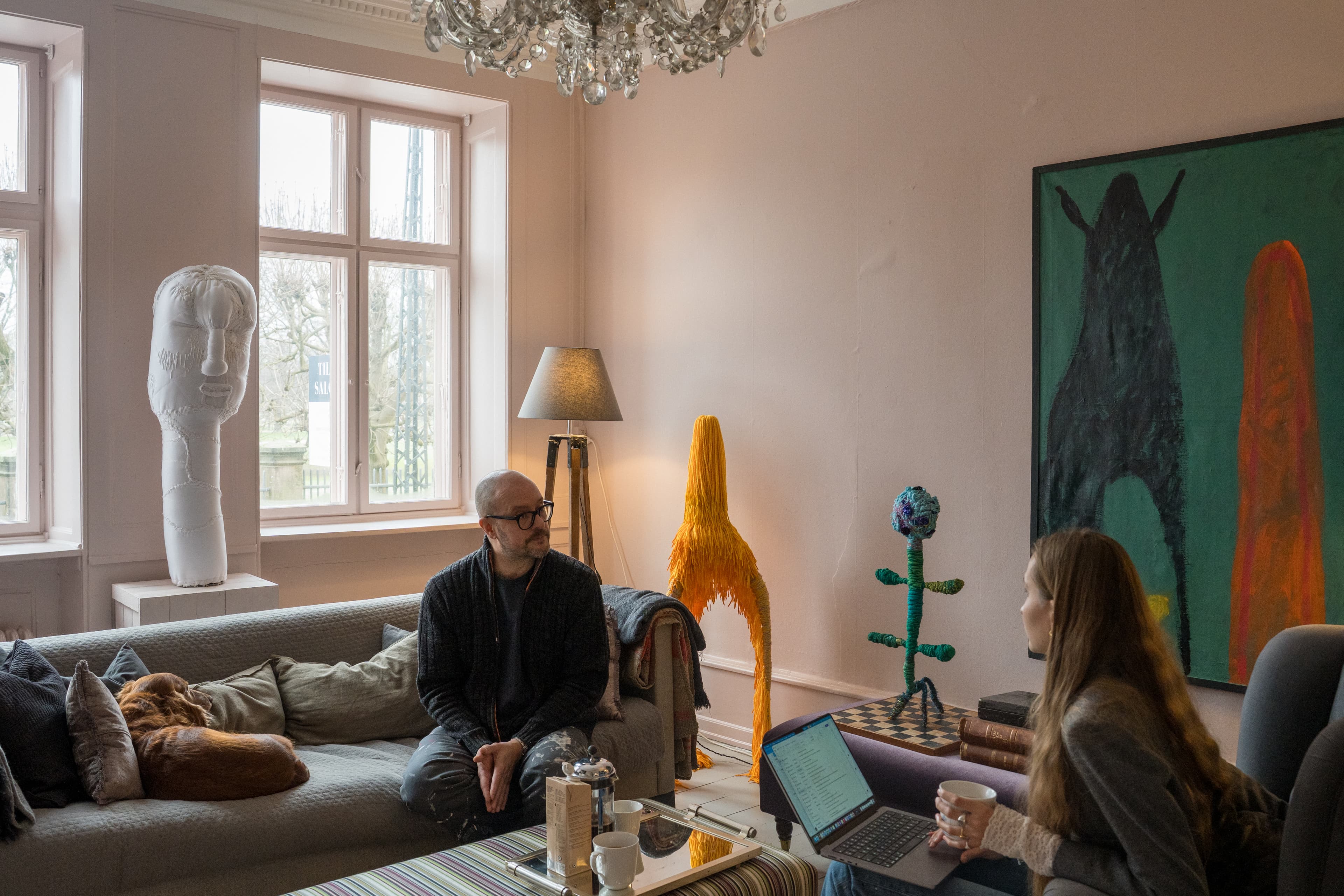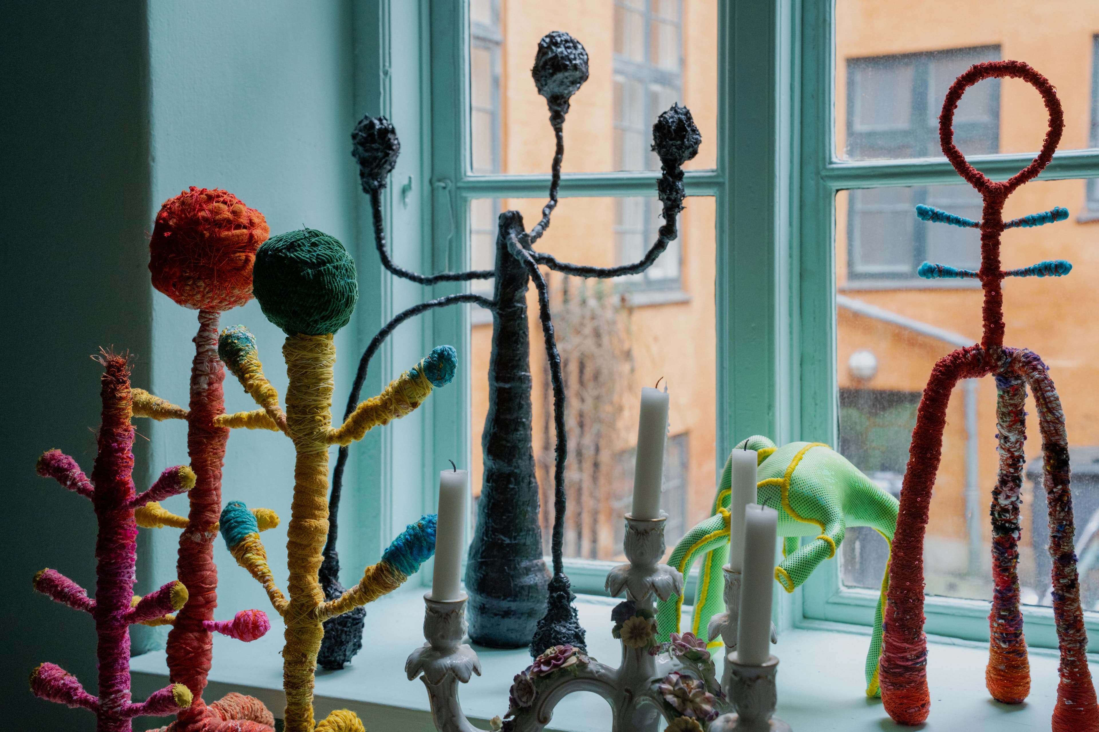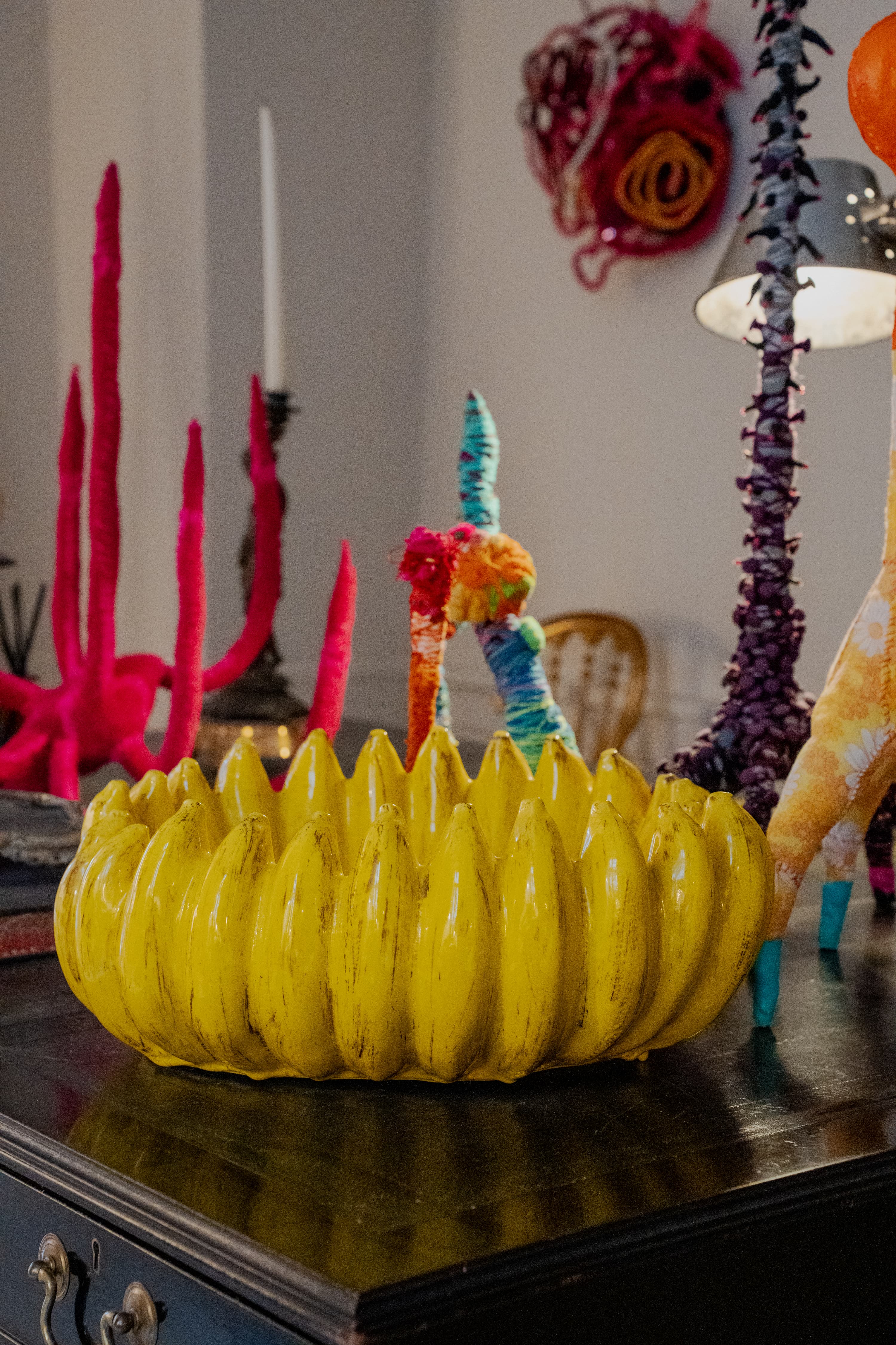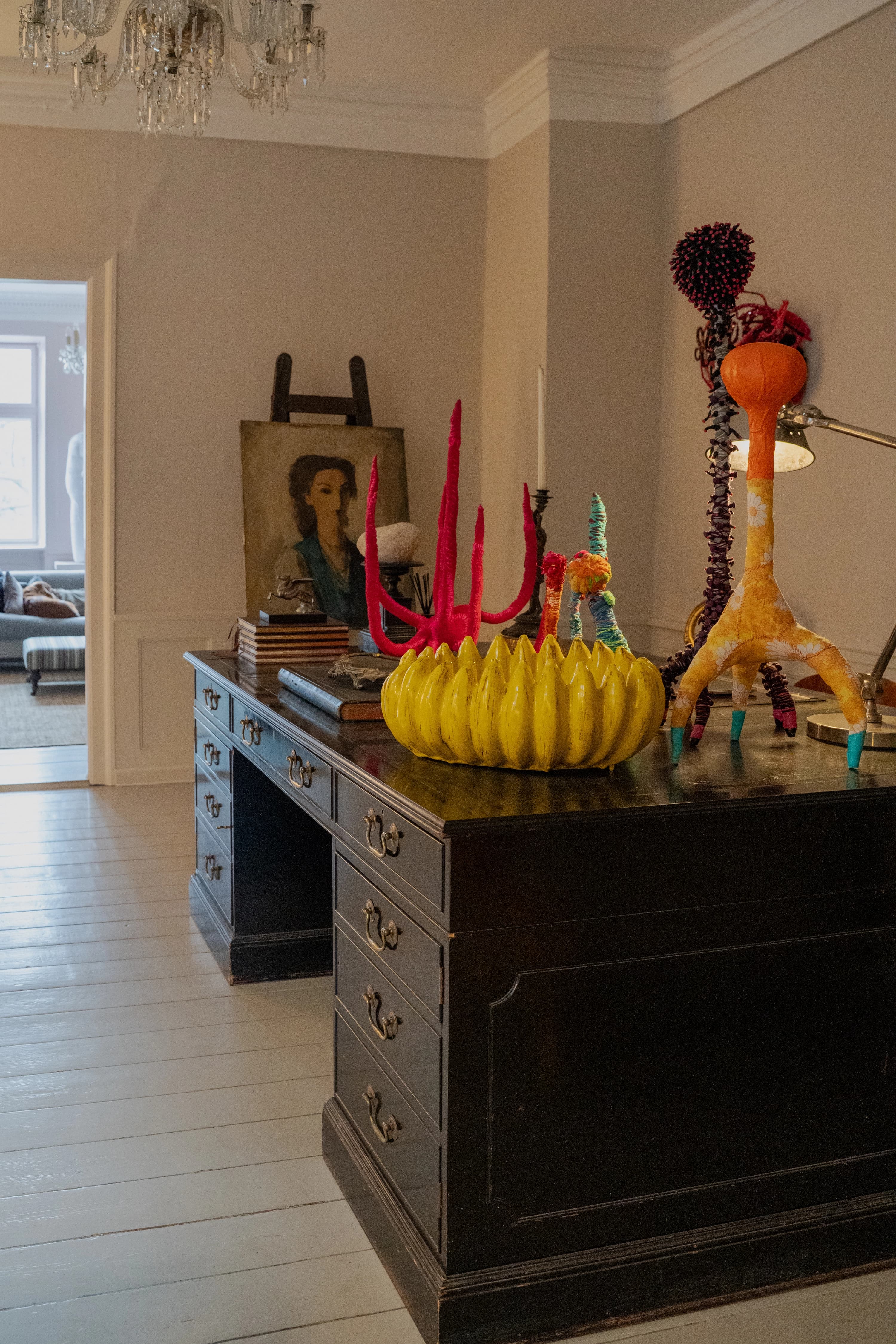 Lejlighedens anden stue er indrettet som kontor. Et stort, sort vintage-skrivebord fylder rummet, dækket af farverige skulpturer, så der kun lige er plads til computeren. Figurerne er skabt af genbrugsskum, akrylmaling og genbrugt stof i en eksplosiv farvepalet, som alligevel fremstår harmonisk. Skulpturerne stammer fra Shanes første soloudstilling, Beauty in the Beast, som blev vist i Nikolaj Kunsthal i 2024.