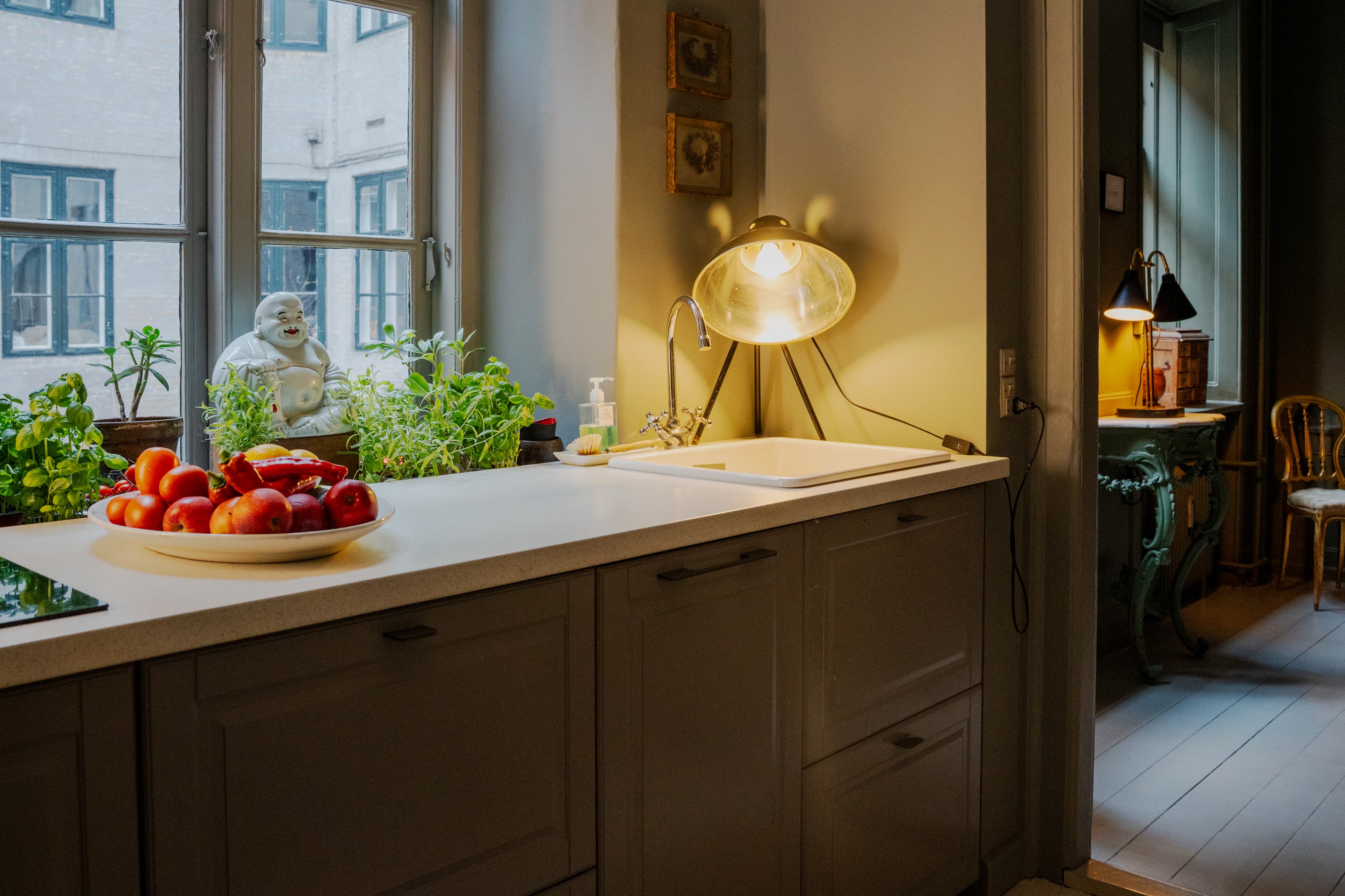 Gulvet knirker, mens Shane viser os rundt i lejligheden, der har en aflang planløsning. Man bevæger sig naturligt gennem alle rum for at nå køkkenet, som ligger længst væk fra gaden. Her findes stadig det oprindelige ildstedsrum, hvor den fredede gruekedelbue af jern er bevaret. I dag fungerer det gamle ildsted til opbevaring af de store gryder og pander samt som forråd af alt fra dåsetomater til hvedemel.