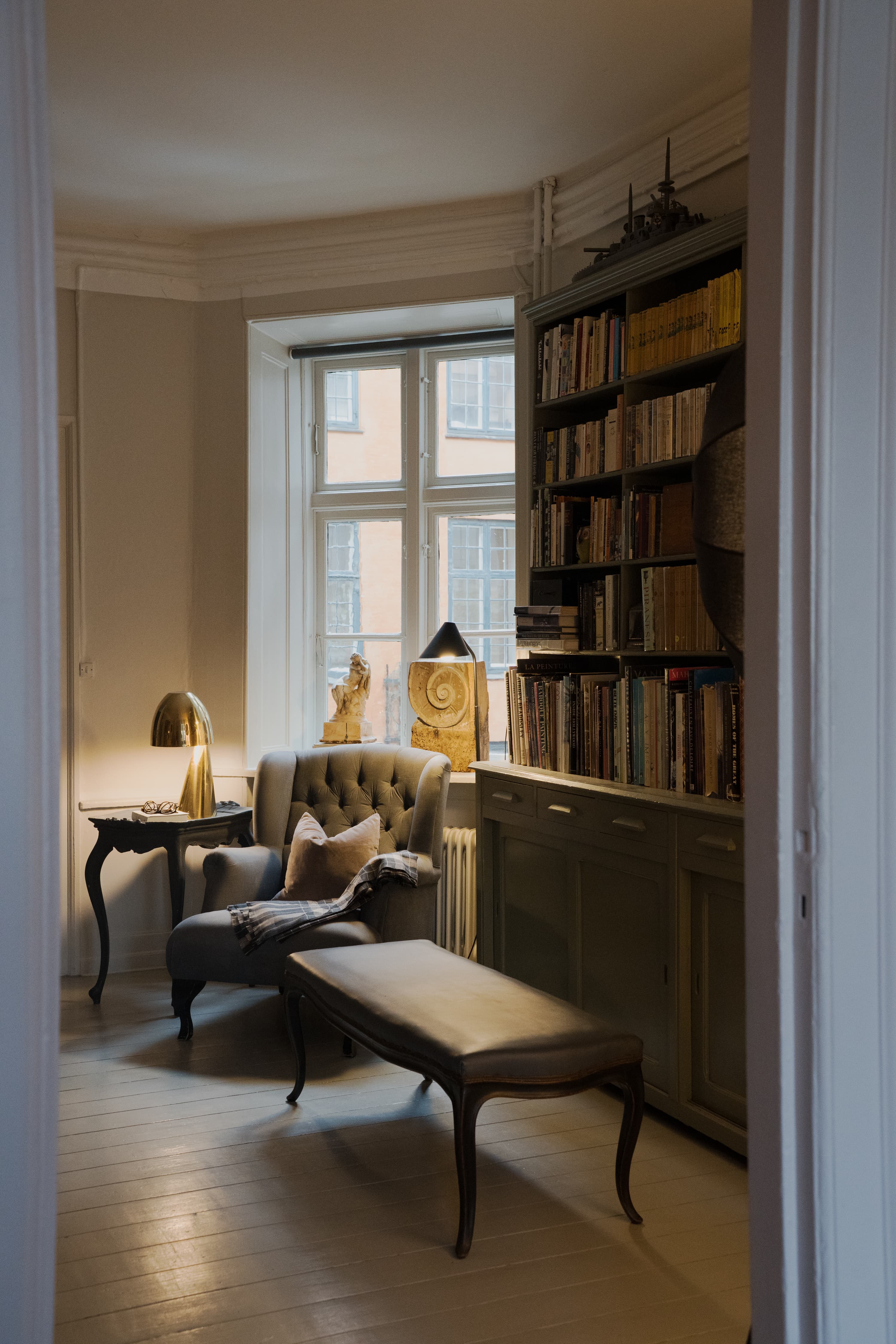 »I en bygning som den her er det hele skævt og fuld af mangler. Der er gamle ledninger og rør, og hvis man begynder at kigge, kan man tænke: Hvorfor er det ikke lavet? Men det er netop dét, der er med til at fortælle en historie og give liv. Der er sjæl i den her lejlighed,« fortæller Shane efter vi har taget plads i henholdsvis sofa og lænestol.