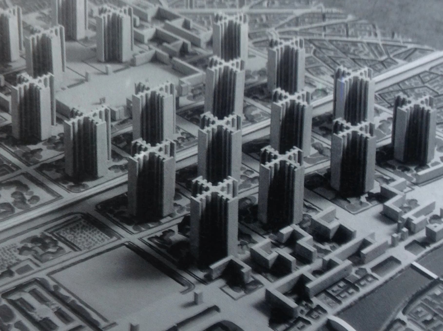 Et af disse udkast til en byplan er Plan Voisin af Le Corbusier. Han forestillede sig en by, hvor mennesker boede i højhuse med masser af lys og luft imellem.