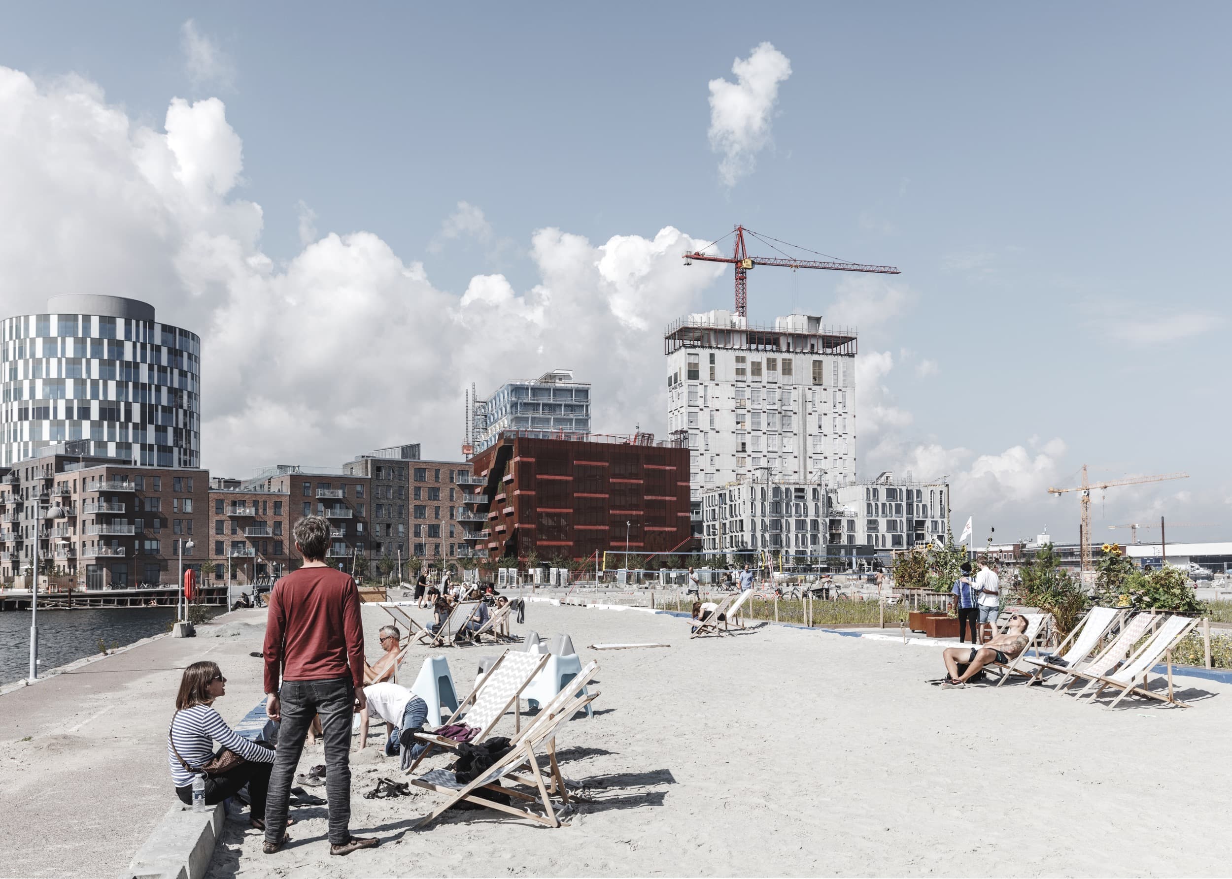 Den lange havnepromenade med Sandkaj Badezone flankerer områdets sydlige grænse og tiltrækker badegæster hele året rundt, mens kvarterets smalle gader hjælper med at reducere mængden af vind.