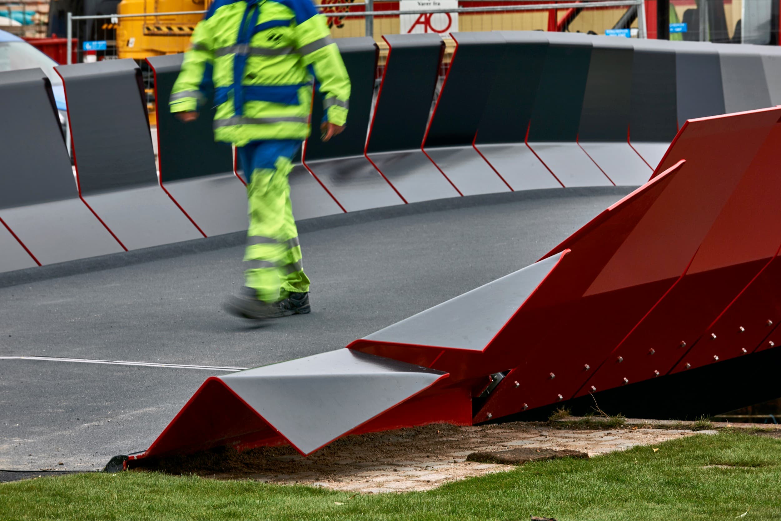 Broens inderside har en sort gummibelægning, som giver kontrast og får den røde farve til at stikke endnu mere ud. Landksbsarkitekterne SLA, har kaldt den 25 meter lange bro "en ørnevinge, hvor siderne er fjernet og gangbroen er hvirvlen”. Det forstår man, når man ser den lette, luftige form.