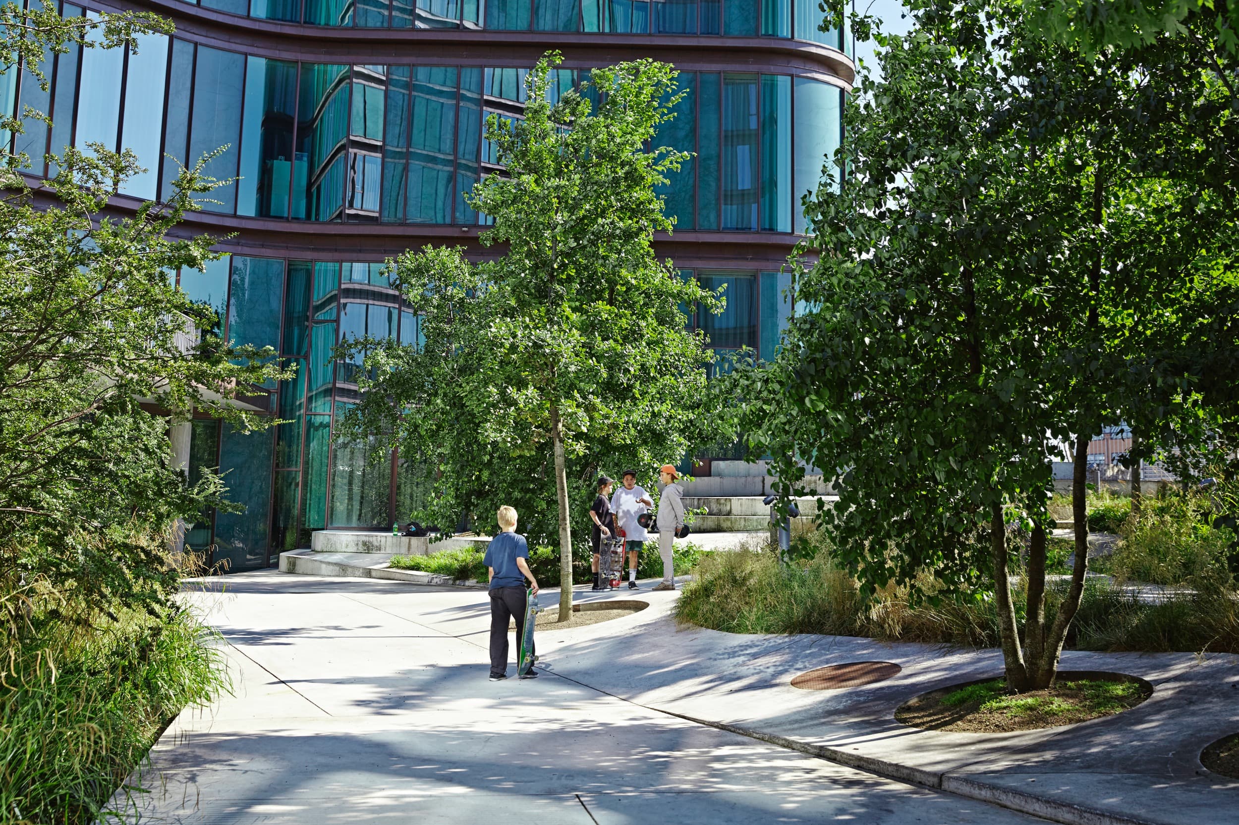 Bag erhvervsbyggeri og hoteller slænger Bymilien sig i flere meters højde over gadeplan. Strækningen er udformet som et svensk bjerglandskab og tilbyder overraskende ro i et af de mest trafikerede områder af byen.