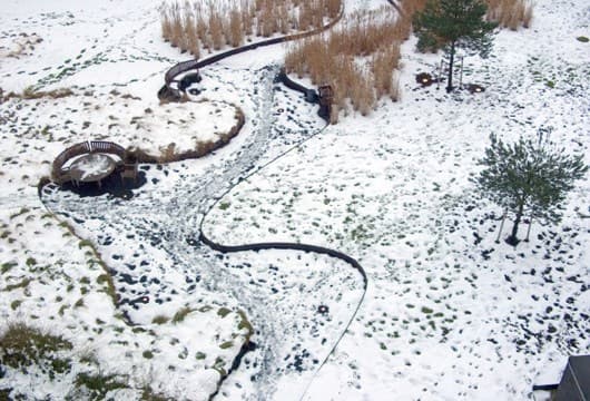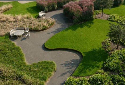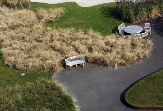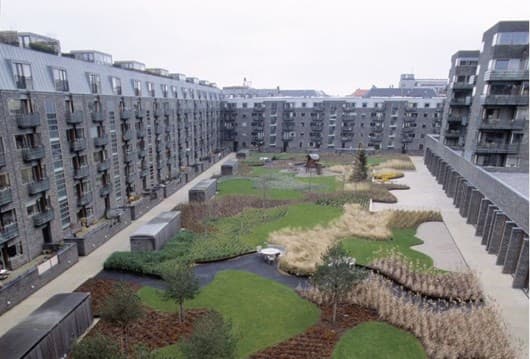 Det er Lundgaard & Tranberg Arkitekter, som har tegnet bygningerne, og SLA har skabt det særprægede gårdrum, der er kendetegnet ved et væld af forskellige materialer og græssorter, lige fra helt kortklippet græsplænegræs og dværgpibegræs til to meter højt elefantgræs. Gårdrummet skifter karakter med årstiderne, fordi græsserne om efteråret og vinteren står i gyldne og varme toner og om sommeren i kølige blå og grønne toner.