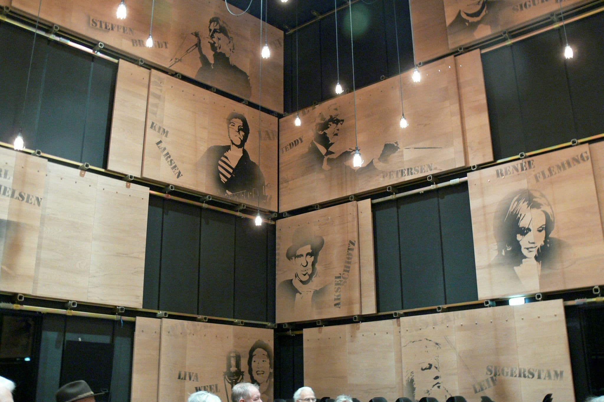 Koncertsalens loft og terrassernes vægge er af krydsfiner, som har udfræsninger af hensyn til akustikken. Over terrasserne er væggene bølgede og udført i gips. For at sikre korrekt gengivelse af dybe toner, er væggene op til seks lag tykke og vejer mindst 100kg pr. m².