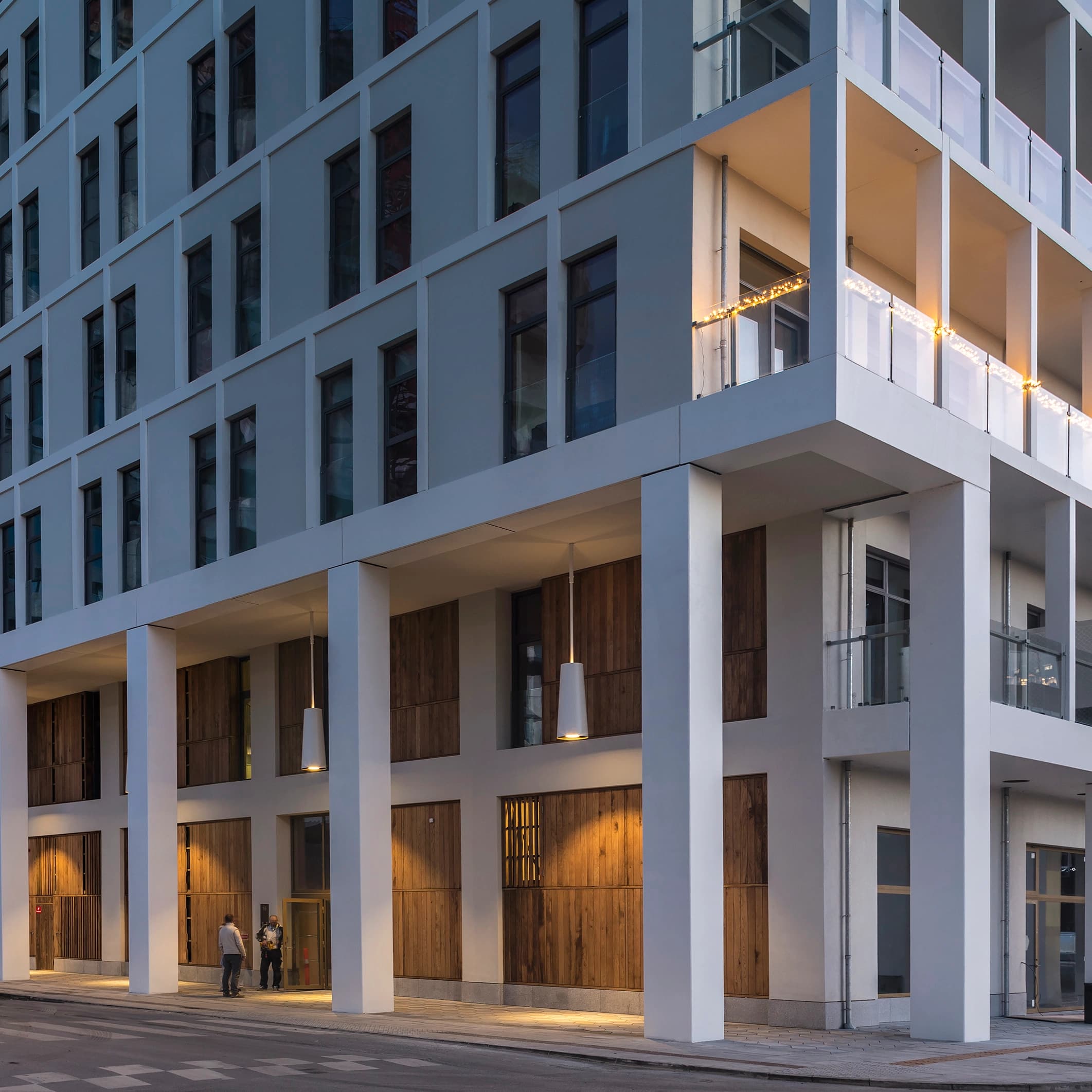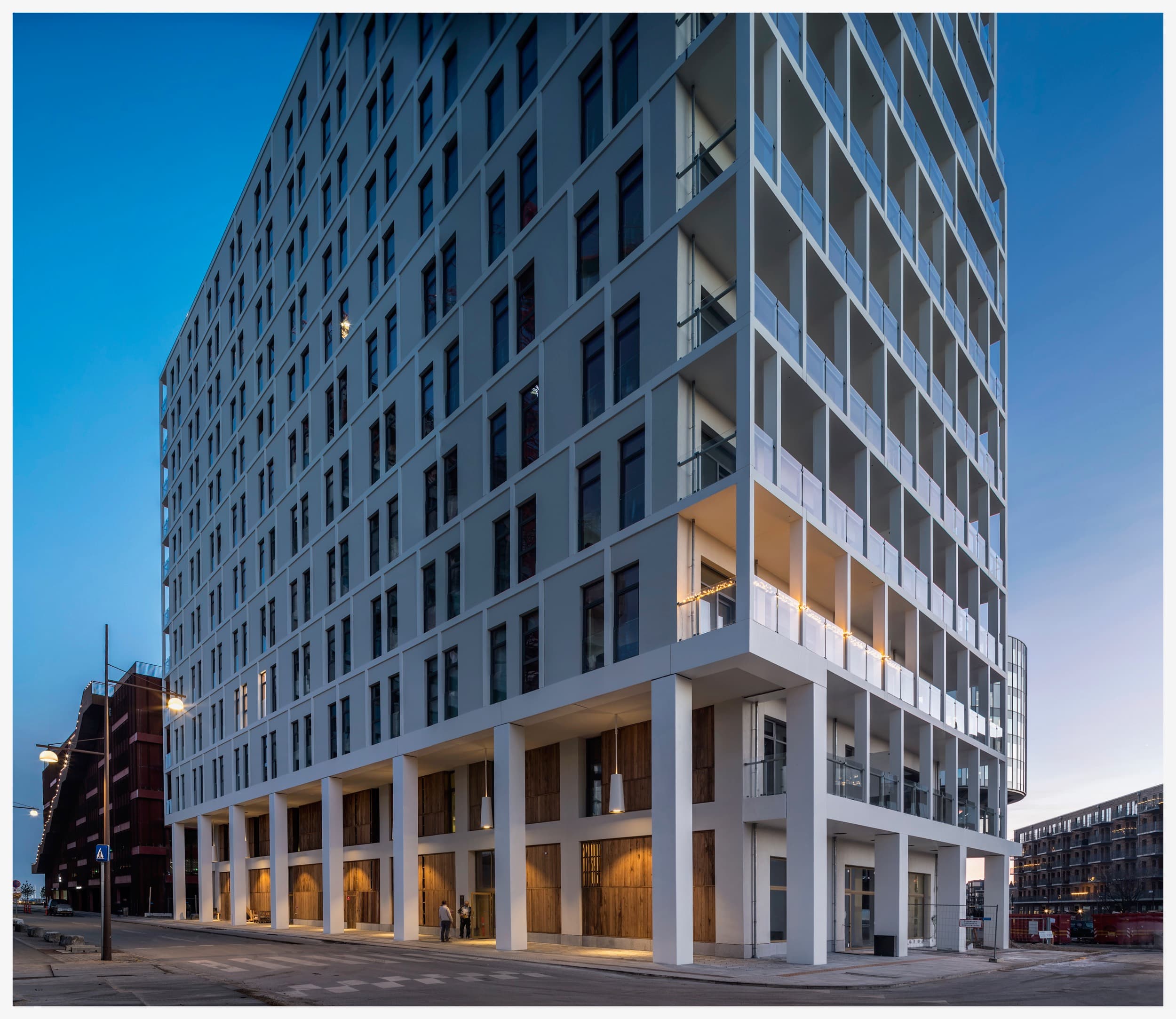 Bevæger man blikket op langs bygningen, ser man tynde, hvide søjler og en varieret facade af generøse, luftige balkoner og store vinduespaneler, der giver alle lejligheder masser af lys.