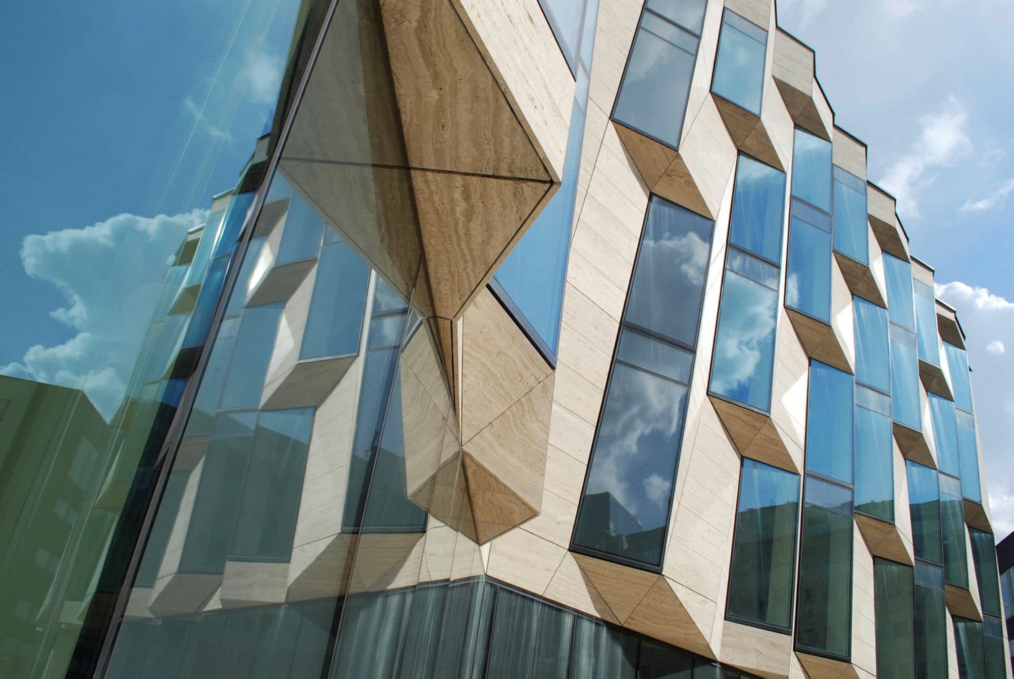Facaden er konstrueret som en sandwich med to lag glasfiber materiale og en kerne af højisolerende skum i mellem. Det er aldrig gjort før i bygninger. Men at det lykkedes at udvikle metoden, har gjort det muligt at masseproducere facadens dele uden at bruge tunge stålelementer til montering, som man ellers ville have gjort. Facaden er nu både selvbærende og skærmer på grund af sit dybe relief for solen uden at tage udsigten over vandet.