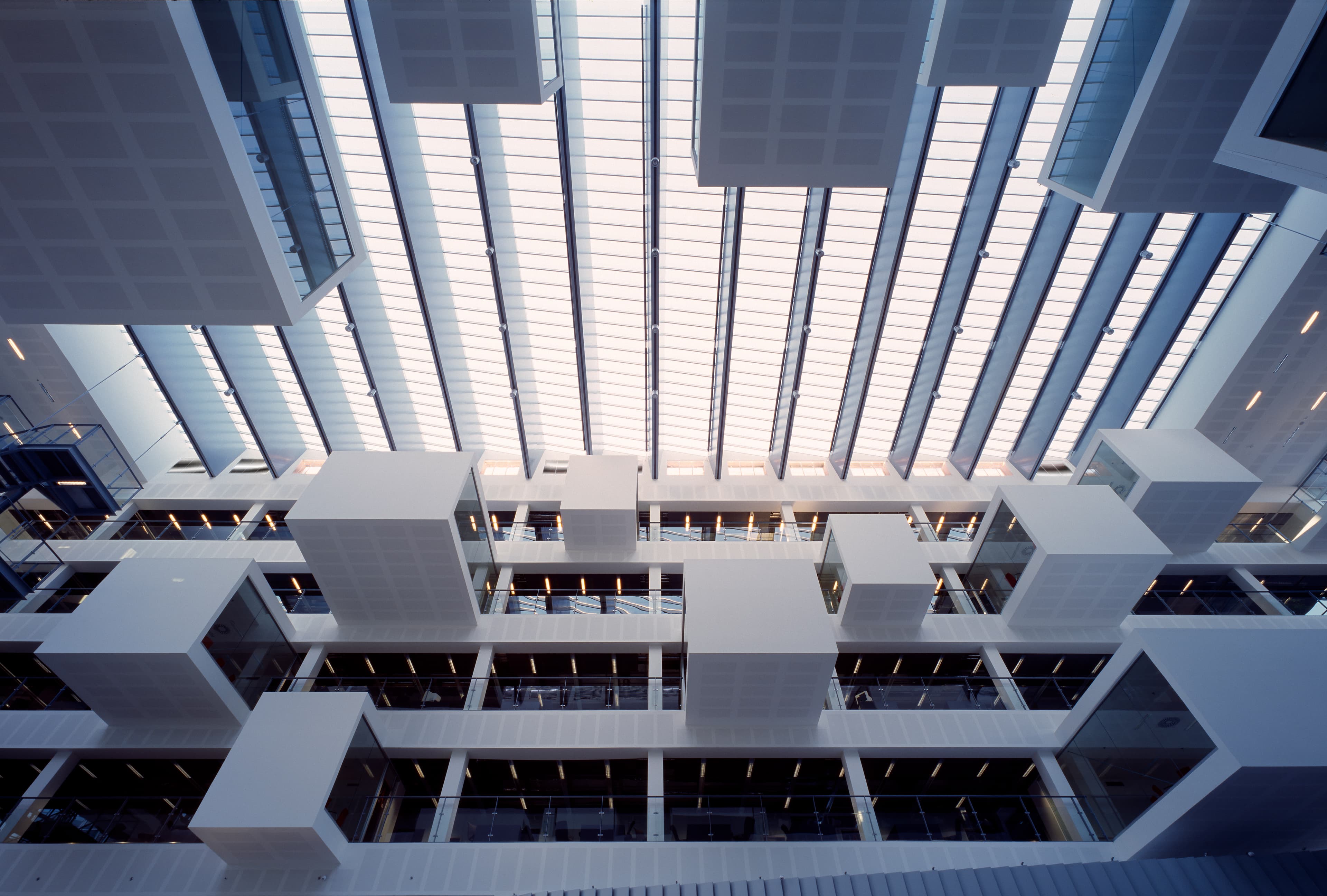 De fem etager er åbne ud mod atriummet, og fra balkonerne kan man overskue aktiviteter andre steder i huset. Studerende, der hilser og vinker på tværs af den store bygning, er derfor ikke noget særsyn. En række lokaler til møder og gruppearbejde er forlænget ud i atriummet, hvor de hænger som en lang række transparente 'skuffer', der er trukket ud i forskellig længde.