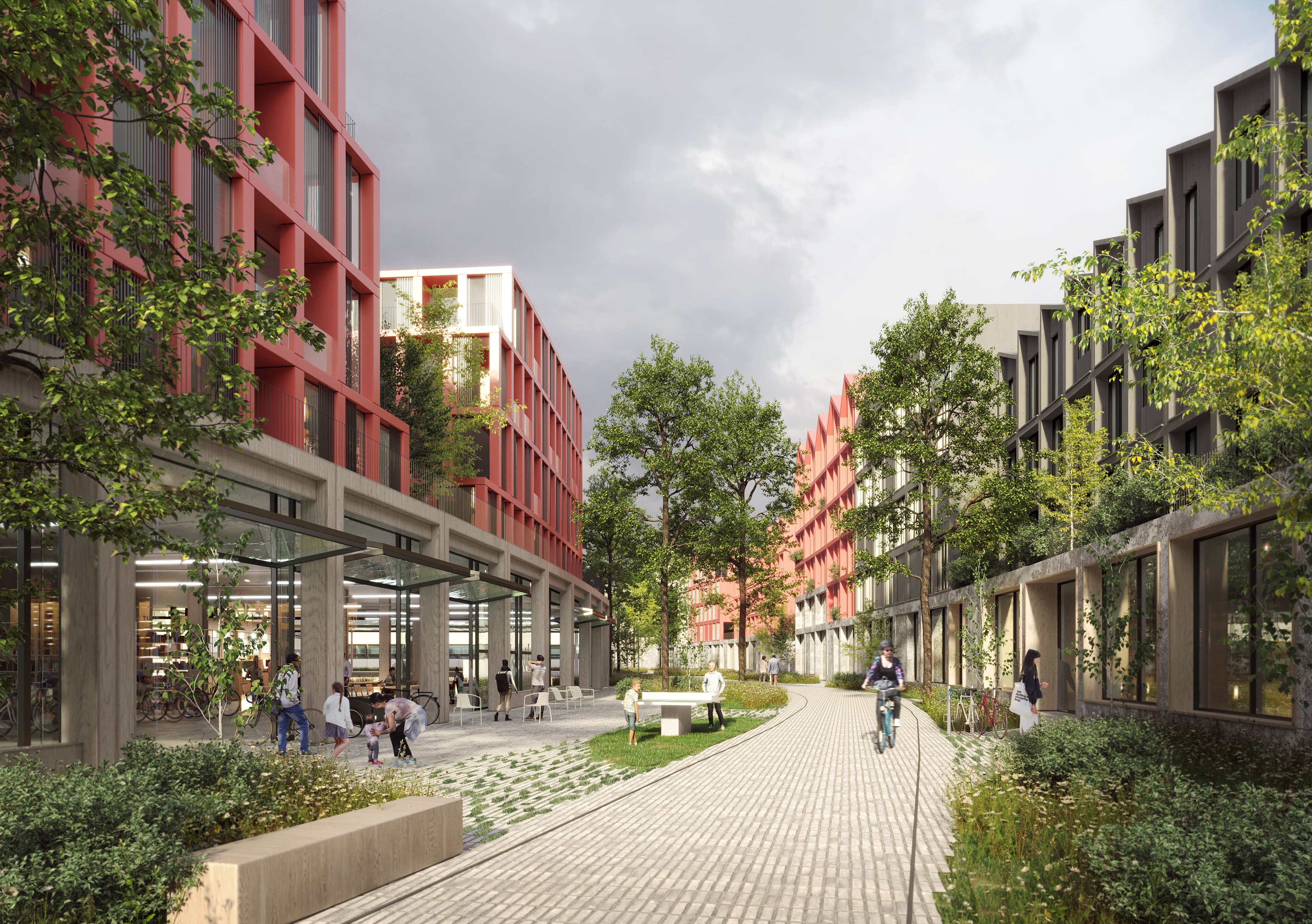 I bydelens periferi bygges grønne parkeringshuse, der både skærmer for byens støj, og muliggør skabelsen af en bilfri bydel, hvor alle offentlige rum mellem husene bliver rekreative grønne oaser. Jernbanebyen kommer derfor til at gøre op med den traditionelle byplanlægning og de skarpe grænser mellem bygninger, veje og grønne lommer.