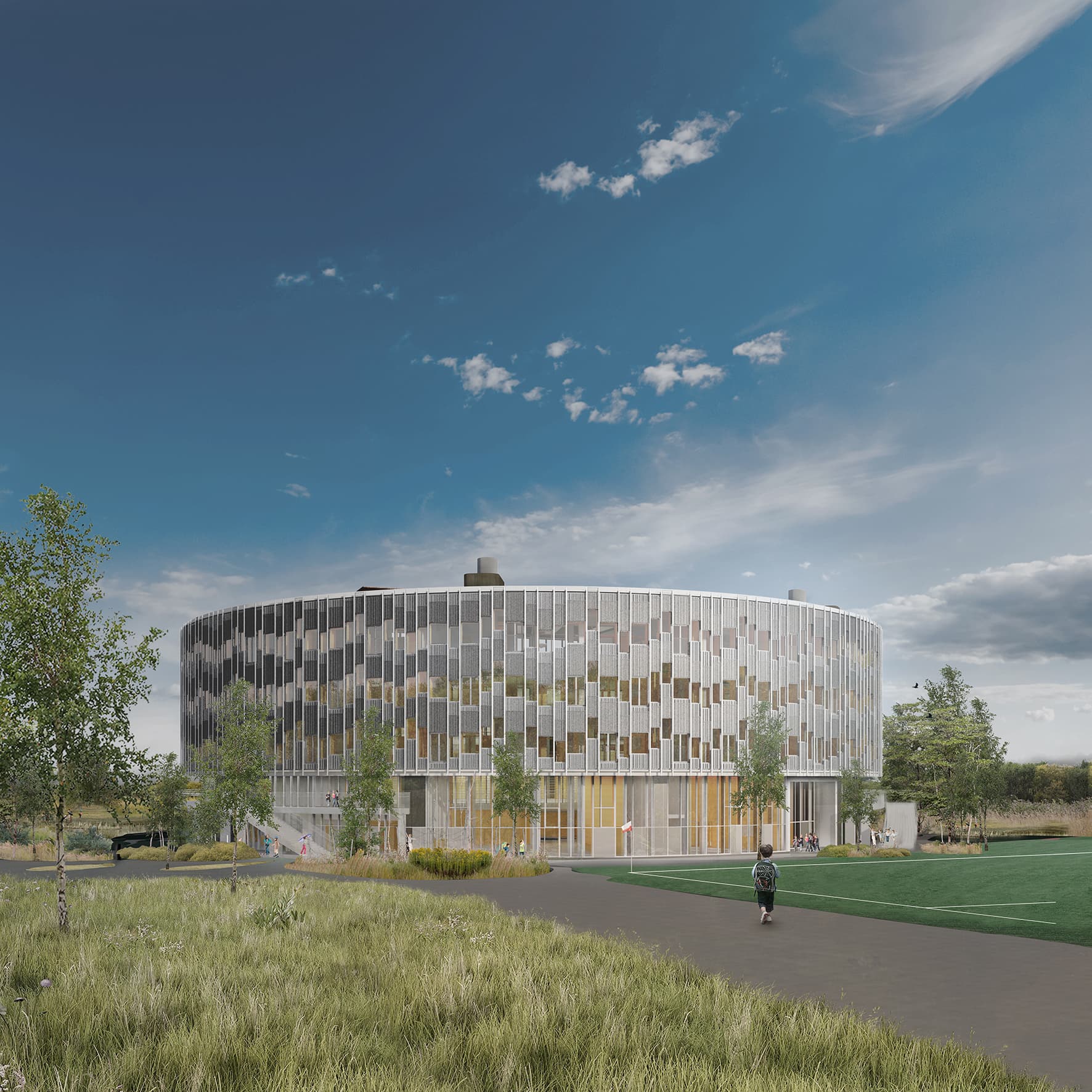 Skolen ligger ved Arenakvarterets grønne korridor 'By fælleden'. Den runde form vender sig udad for at forbinde brugerne med den smukke natur på Kalvebod Fælled i den ene retning til Ørestads centrum samt resten af København til den anden.