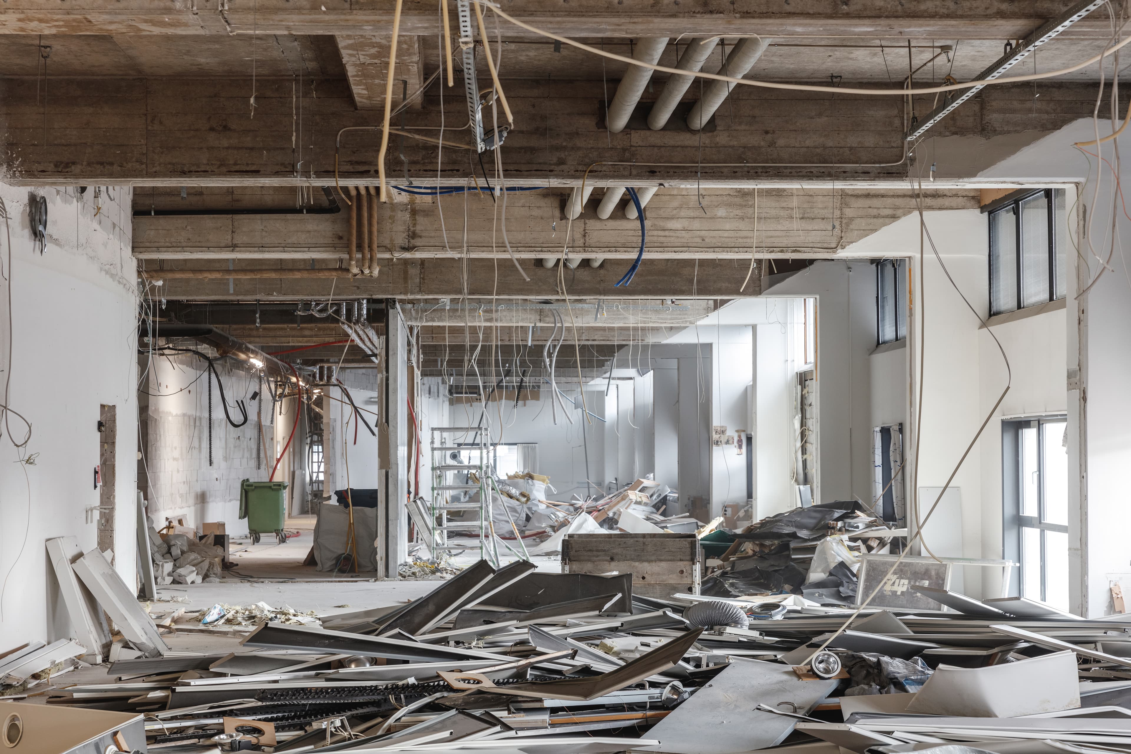 Indenfor er nedhængte lofter fjernet, og etagerne står med en imponerende loftshøjde på næsten 4,5 meter. Sammen med knap 4 meter høje vinduespartier bliver rummene åbnet og får naturligt dagslys kastet helt ind i den dybe bygning, hvor de lyse, rå betonbjælker er bevaret og giver et industrielt udtryk.