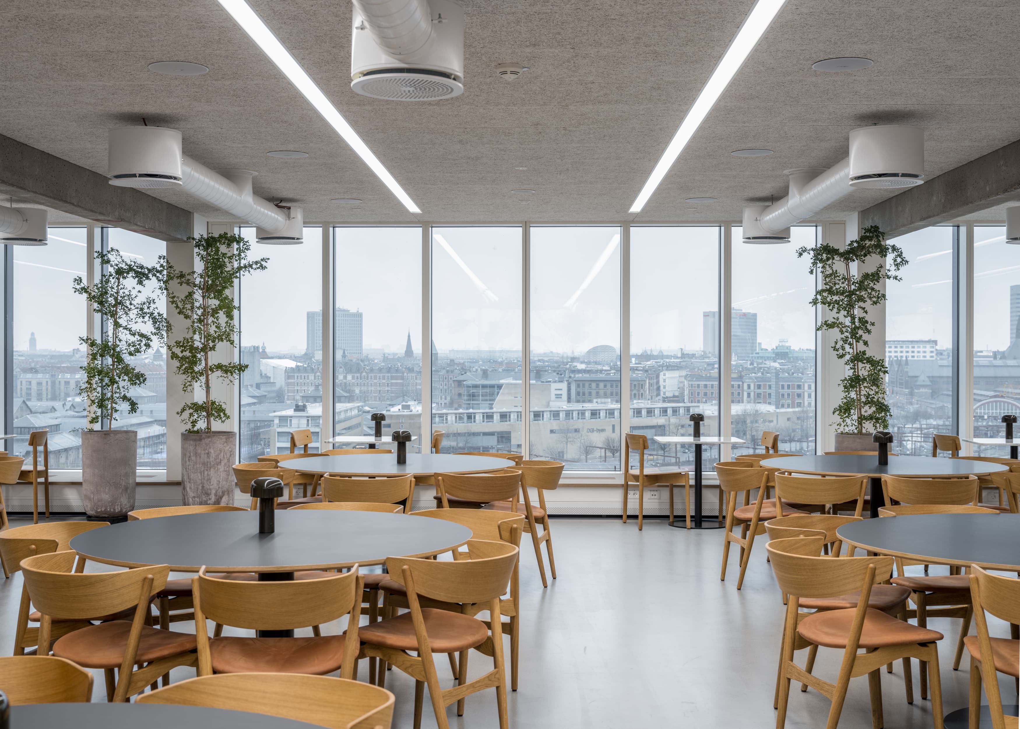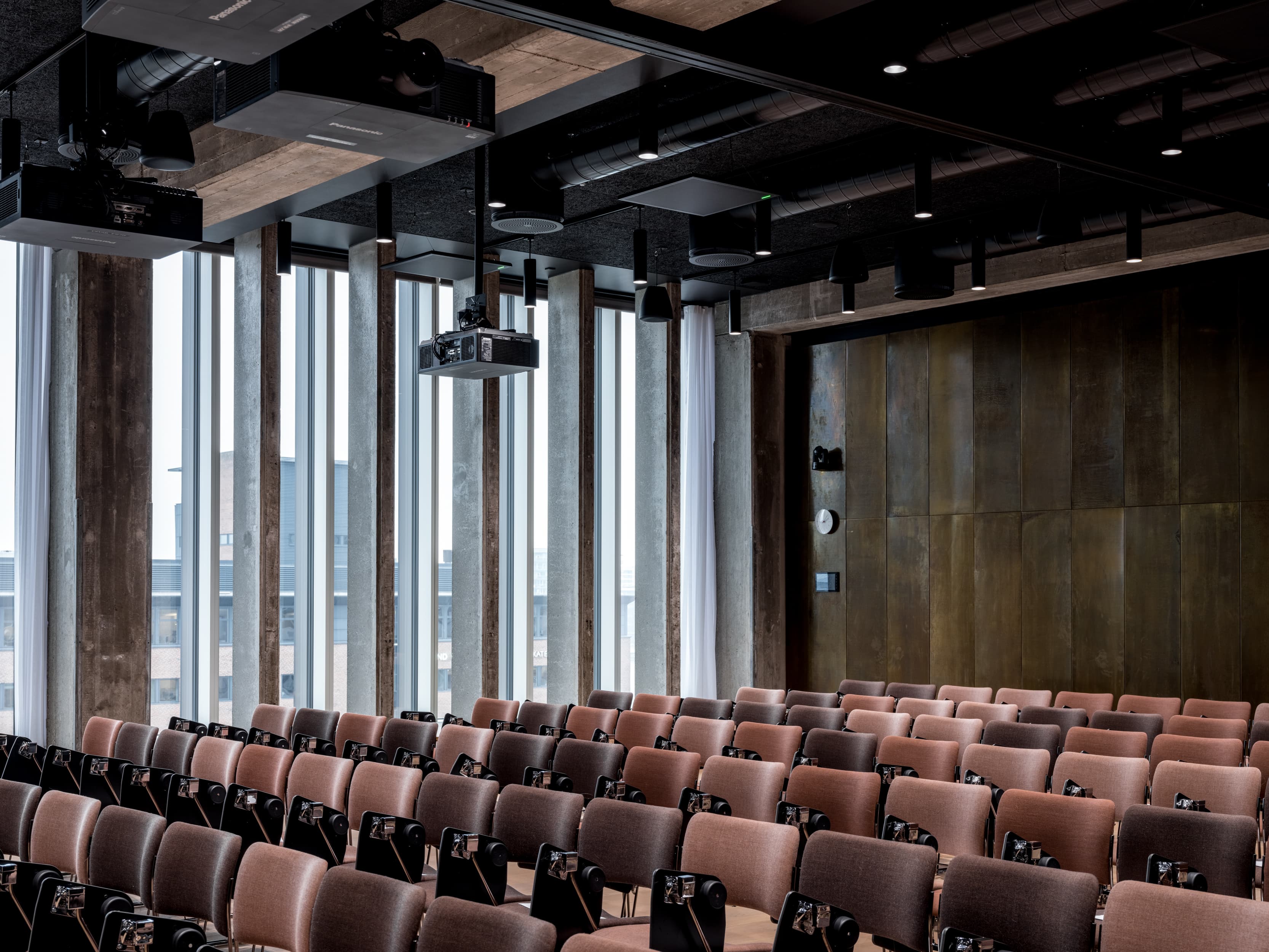 De høje rum har også krævet et særligt fokus på akustik. Store dele af bygningens indvendige overflader er dækket med mikro-perforerede, varmvalsede stålpaneler med bagvedliggende absorberende materiale, der dæmper lyden i kontormiljøet.