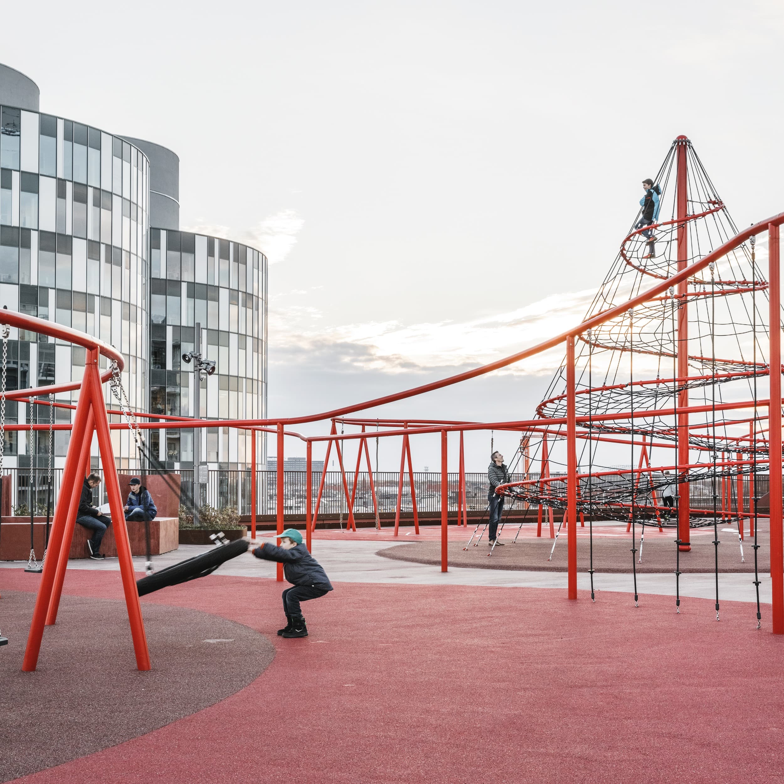 Der er plads til leg, motion og boldspil på taget af parkeringshuset Lüders. 24 meter over jorden giver Konditaget Lüders et anderledes syn på Nordhavn og byen.