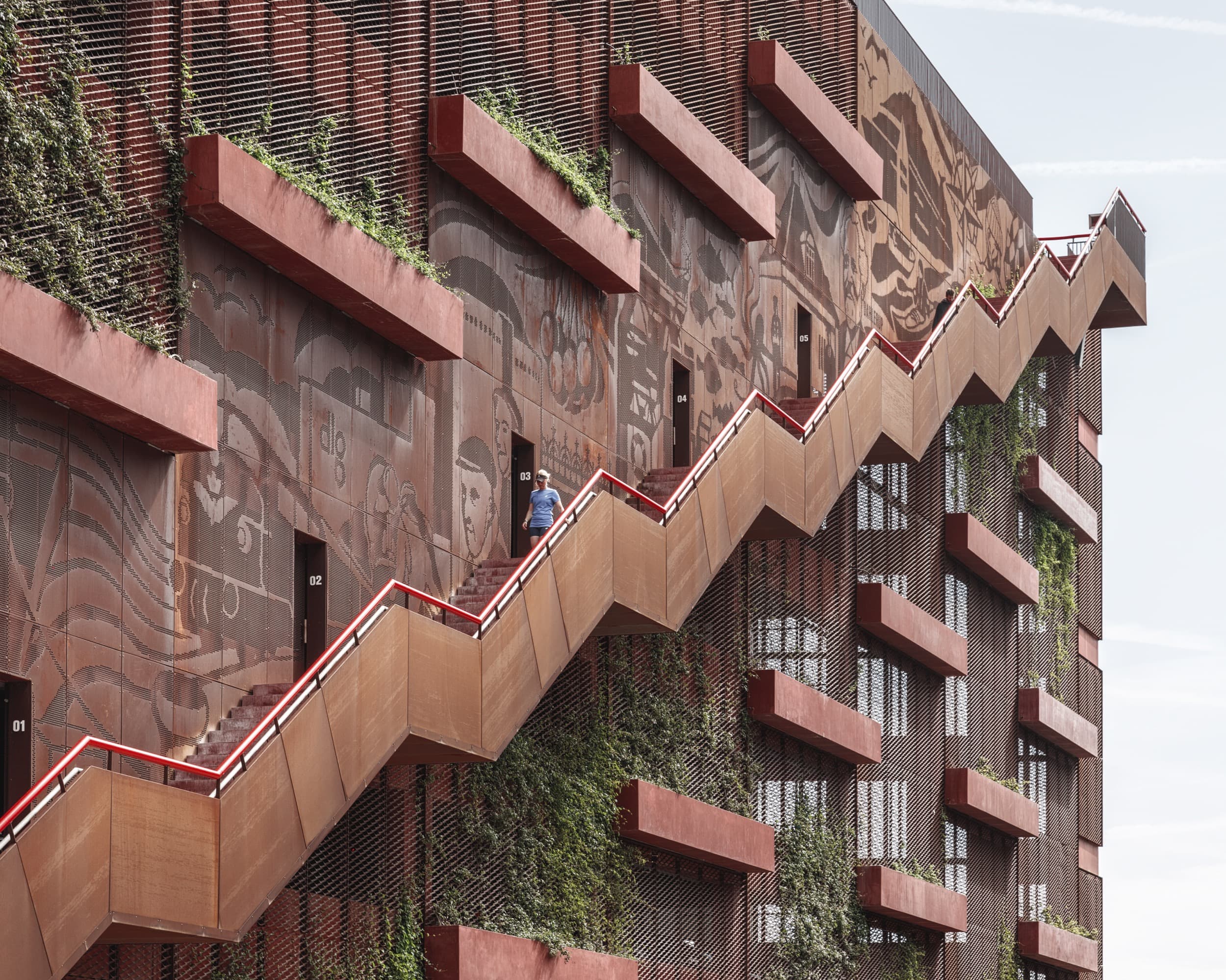 To diagonale trapper på facaden af parkeringshuset leder til taget i 24 meters højde. Langs trapperne løber en dekorativ frise, der fortæller Nordhavns historie som industrihavn i billeder af vigtige bygninger, personer og virksomheder. 40 plantekasser med grønne klatreplanter vokser sig vej ud over facaden og den indfarvede røde beton.