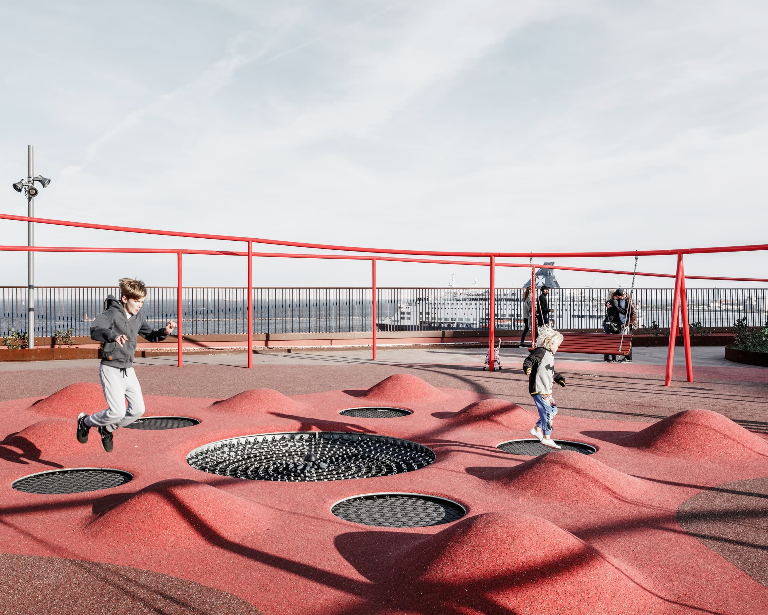 Når man kommer op på taget, åbner der sig et rummeligt og næsten Mars-lignende landskab. Her træner de seriøse atleter og motionister, mens børnene hopper på trampoliner eller kravler op i reb-tårnet. For dem, der kommer til tops, venter et smukt syn over Københavns tage og tårne.