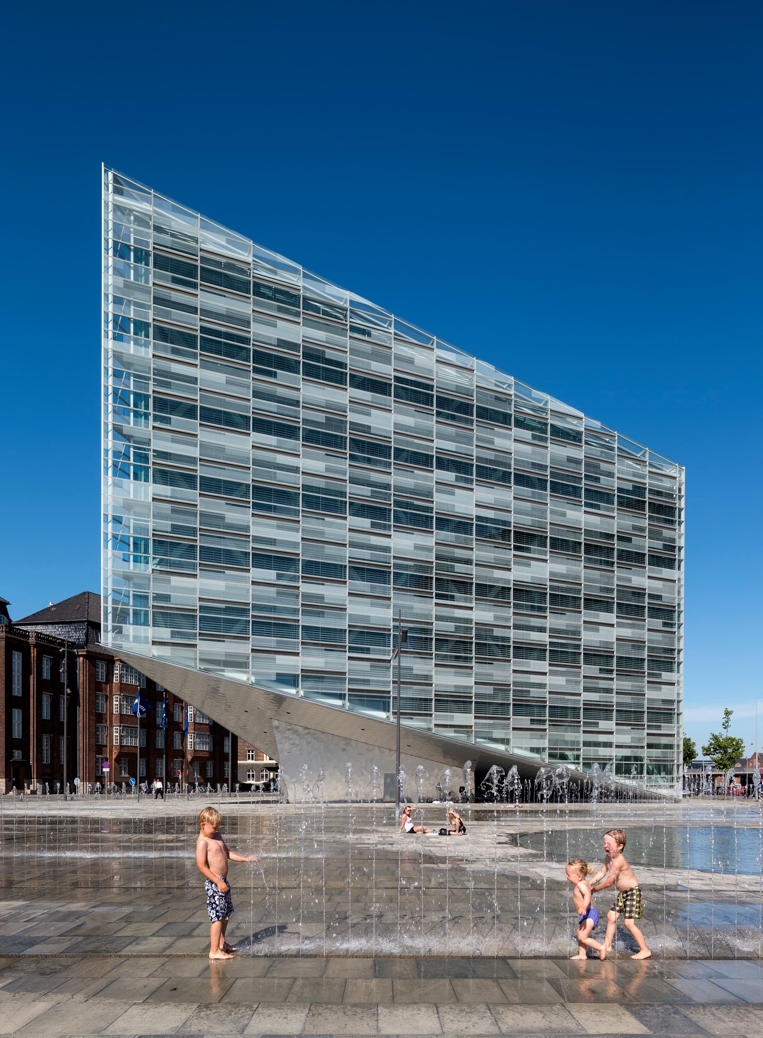 Den bryder med den lange stribe af kompakte erhvervsdomiciler, der ligger med front mod havnen og Kalvebod Brygge. Med kun tre støttepunkter på den åbne plads er der opstået lys og luft, hvor der ellers var trist og lukket.