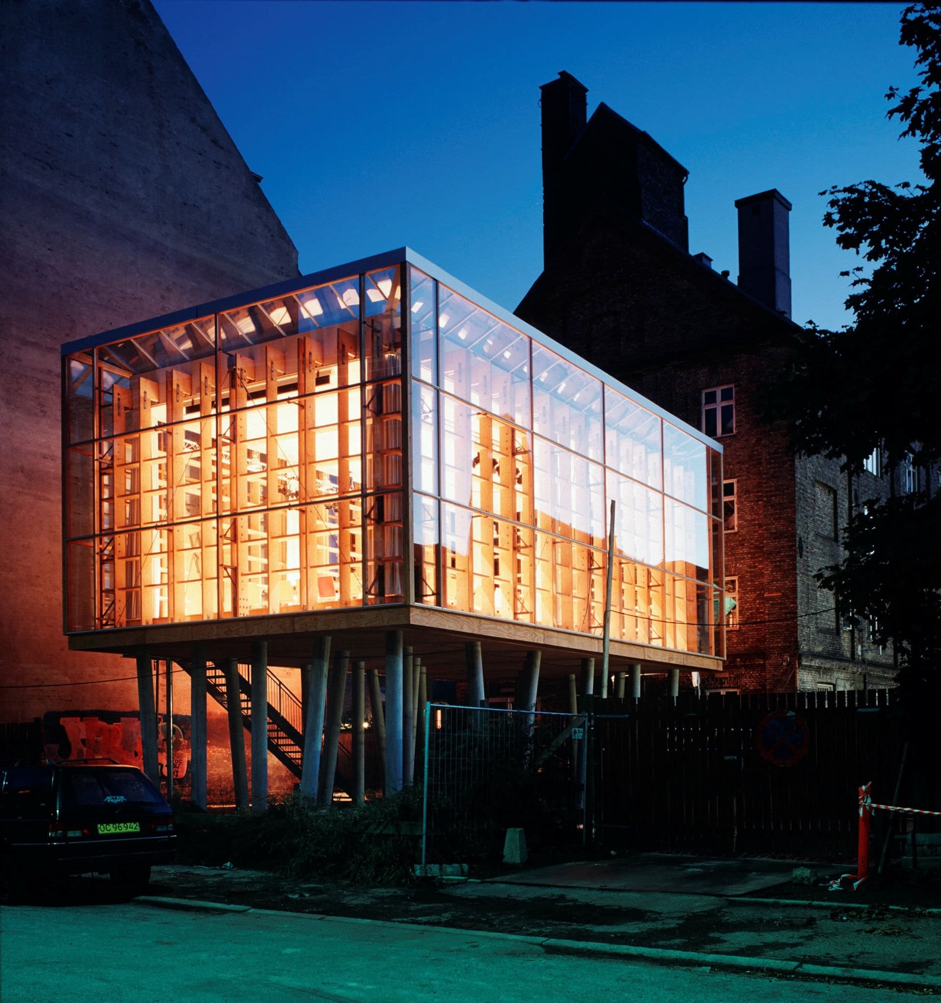 En gammel industribygning på Amager er blevet nænsomt istandsat og tilført en ny tilbygning på pæle, der giver varme til omgivelserne.