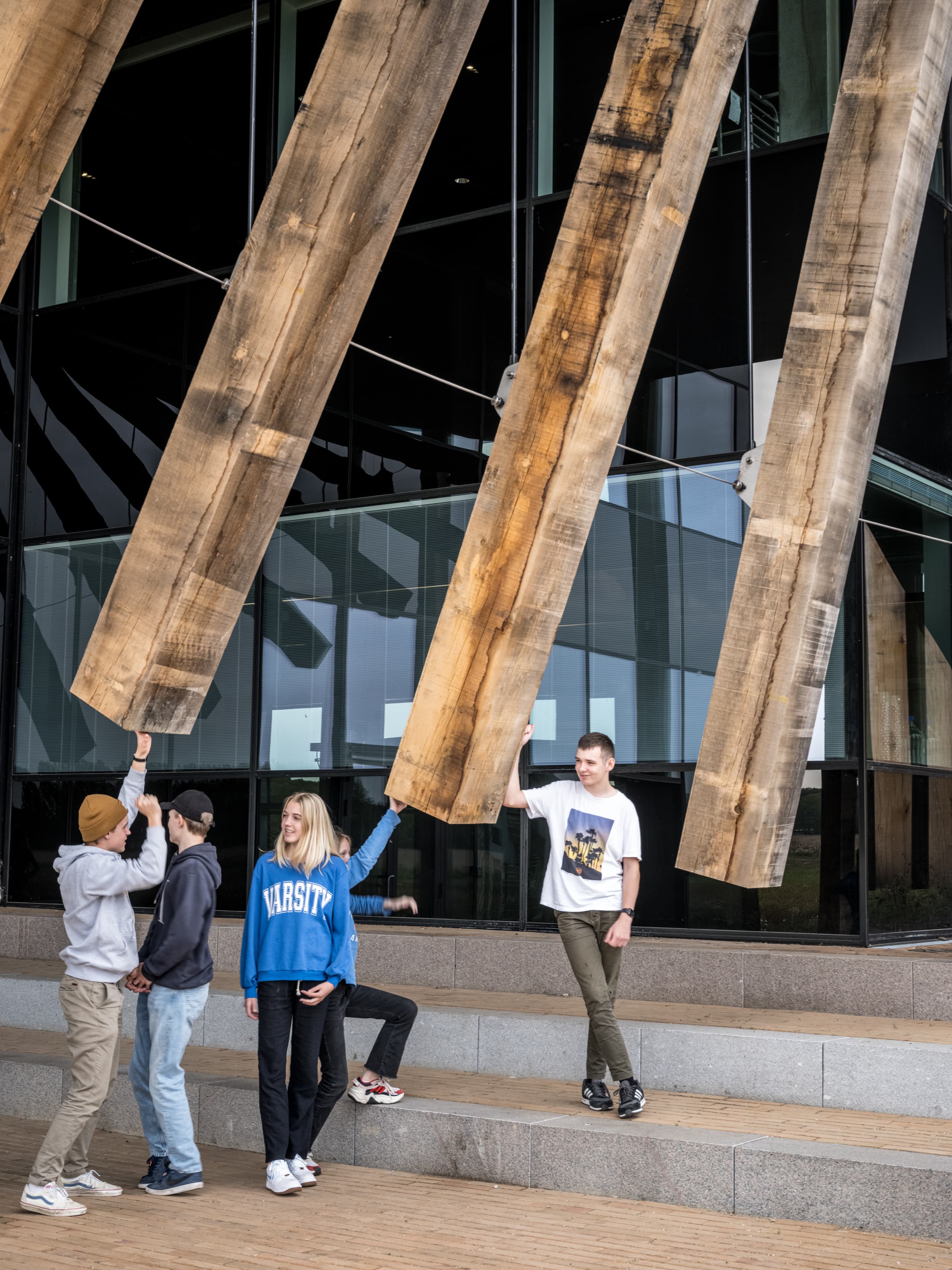 96 søjler af egetræ byder børn og unge velkommen til LIFE Campus, når de ankommer til læringscenteret. Med en højde på 9 meter og en vægt svarende til en personbil er hver enkelt søjle nøje placeret. Samlet udgør de en reference til det matematiske Fibonacci-mønster og DNA-strenge. De 96 egetræssøjler er fremstillet af 150 år gamle træer og markerer overgangen mellem et levende landskab og en levende bygning inspireret af den omkringliggende natur.