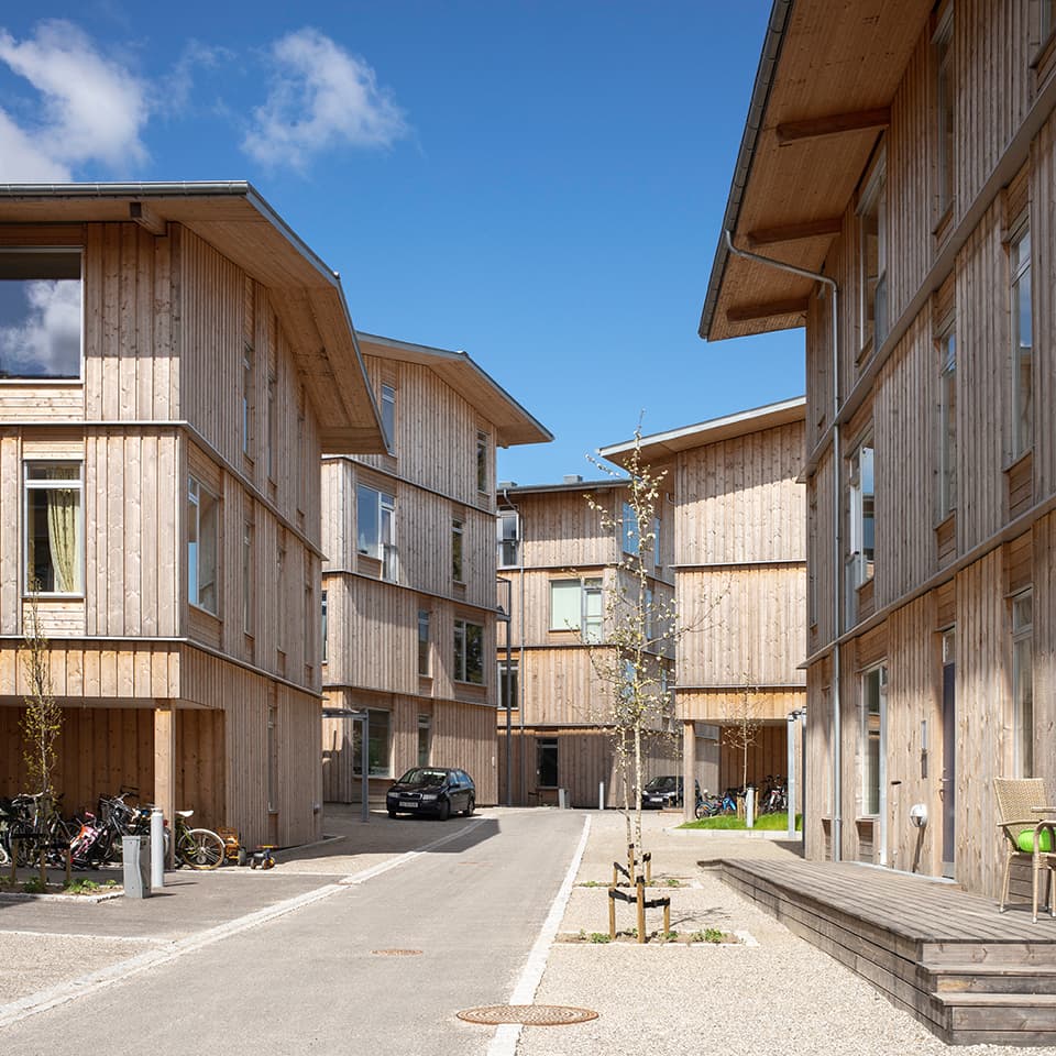 Husene er bygget med et helt nyt system, der har skaffet Danmark sit første etagebyggeri i træ. Navnet på systemet er meget passende ”Wood Stock”, og det er Vandkunsten selv, der har udviklet det i samarbejde med ingeniørerne hos MOE. Det er limtræ, der er brugt i et system af søjlebjælker. Hvor det gav teknisk eller praktisk mening, er det brugt beton og stål i konstruktionen, men træet er både bærende i konkret og i æstetisk forstand.