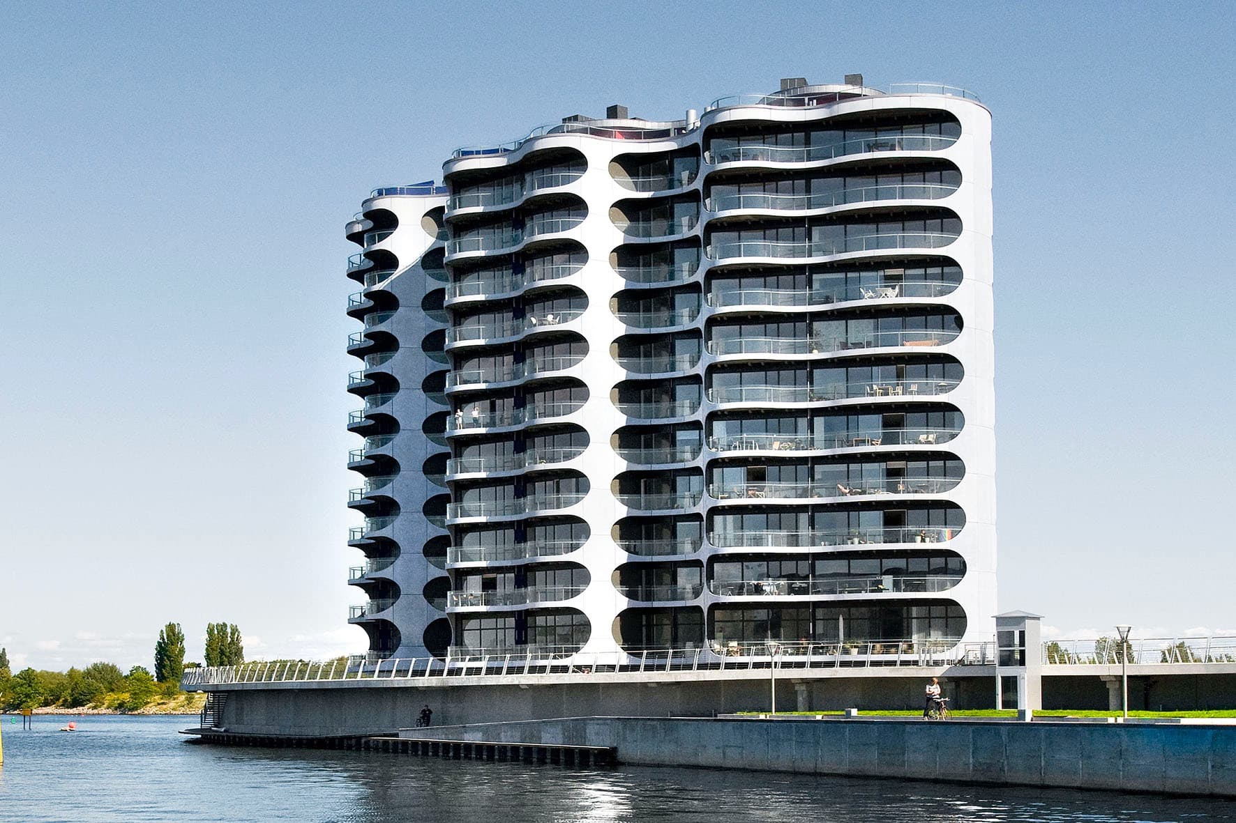 Fra bygningens østside kommer beboerne ind via et af fire atriummer. Herfra spreder lejlighederne sig ud mod de omfattende, buede balkoner med udsigt over Sydhavnen og byen.