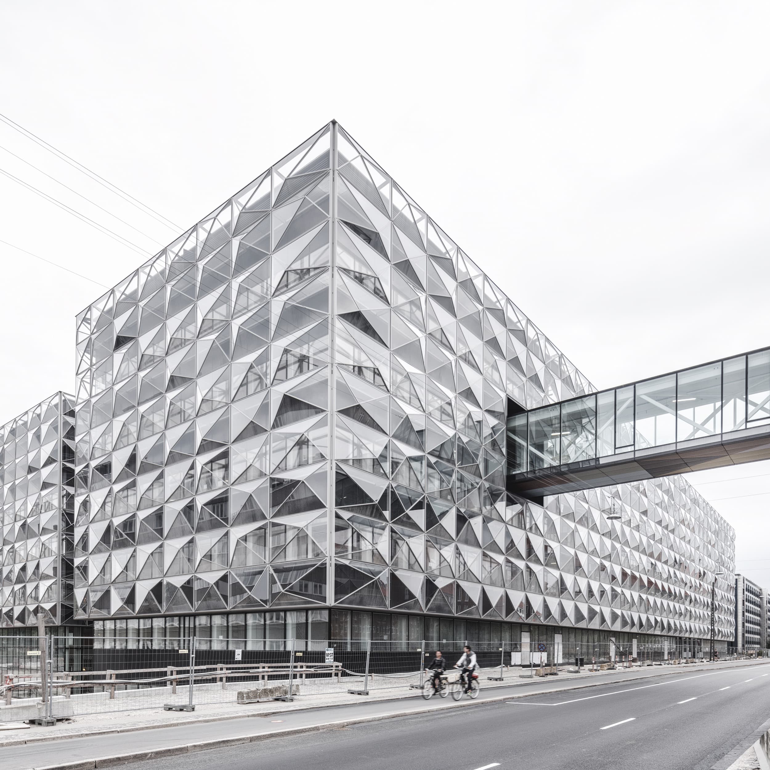 De to bygninger er helt beklædt med pyramideformede glaselementer, der giver spil i facaden, gennemsigtighed og brudte refleksioner. Facademønsteret skal give sammenhæng på tværs af de to bygninger men samtidig sikre et lidt uensartet indtryk.