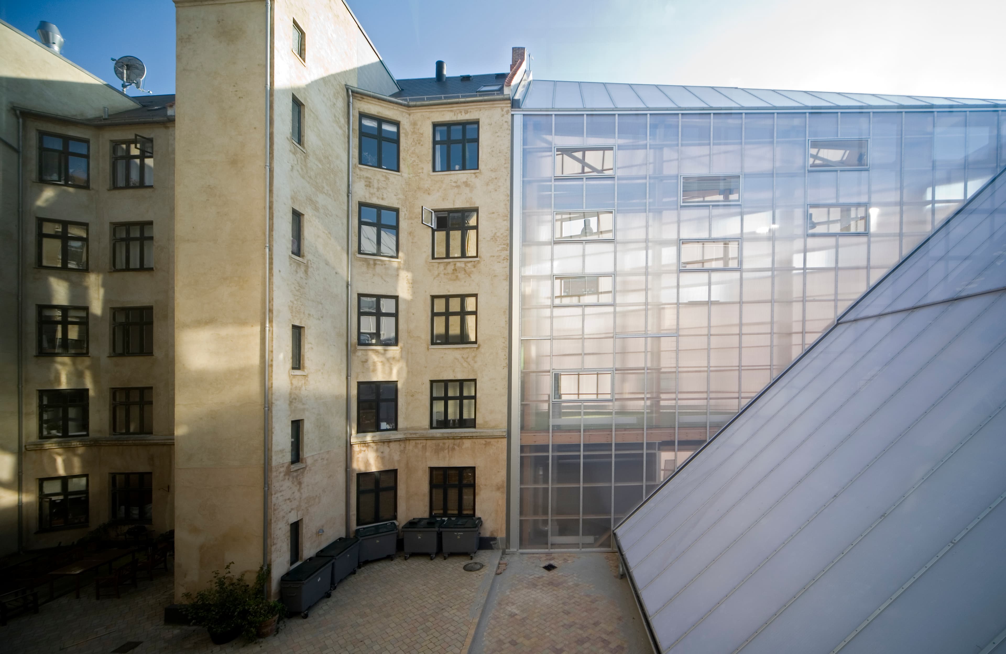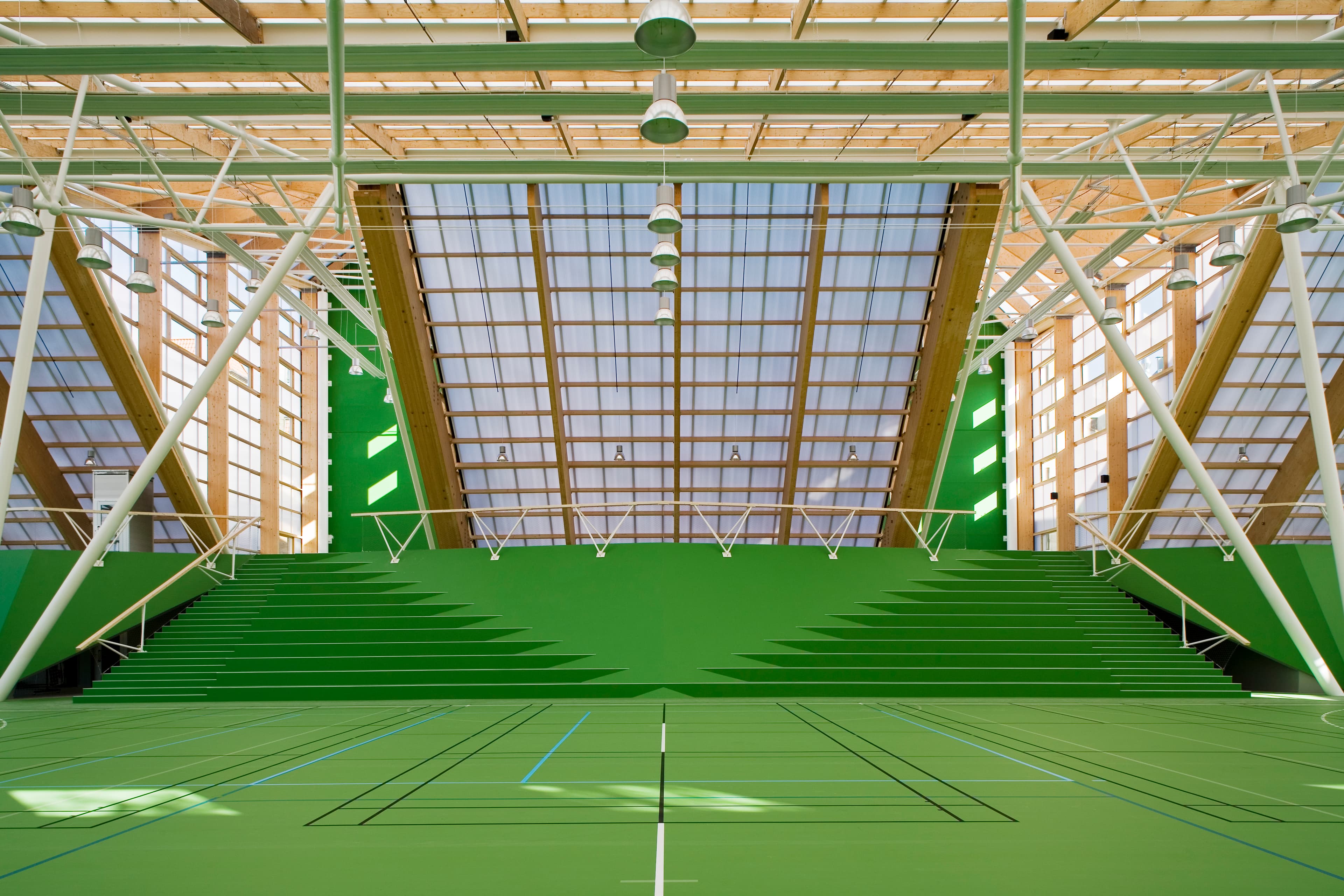Prismens markante lysegrønne indre får enhver til at standse op. Den store multihal er reelt tænkt som et udendørs rum med overdækning spændt ud over.