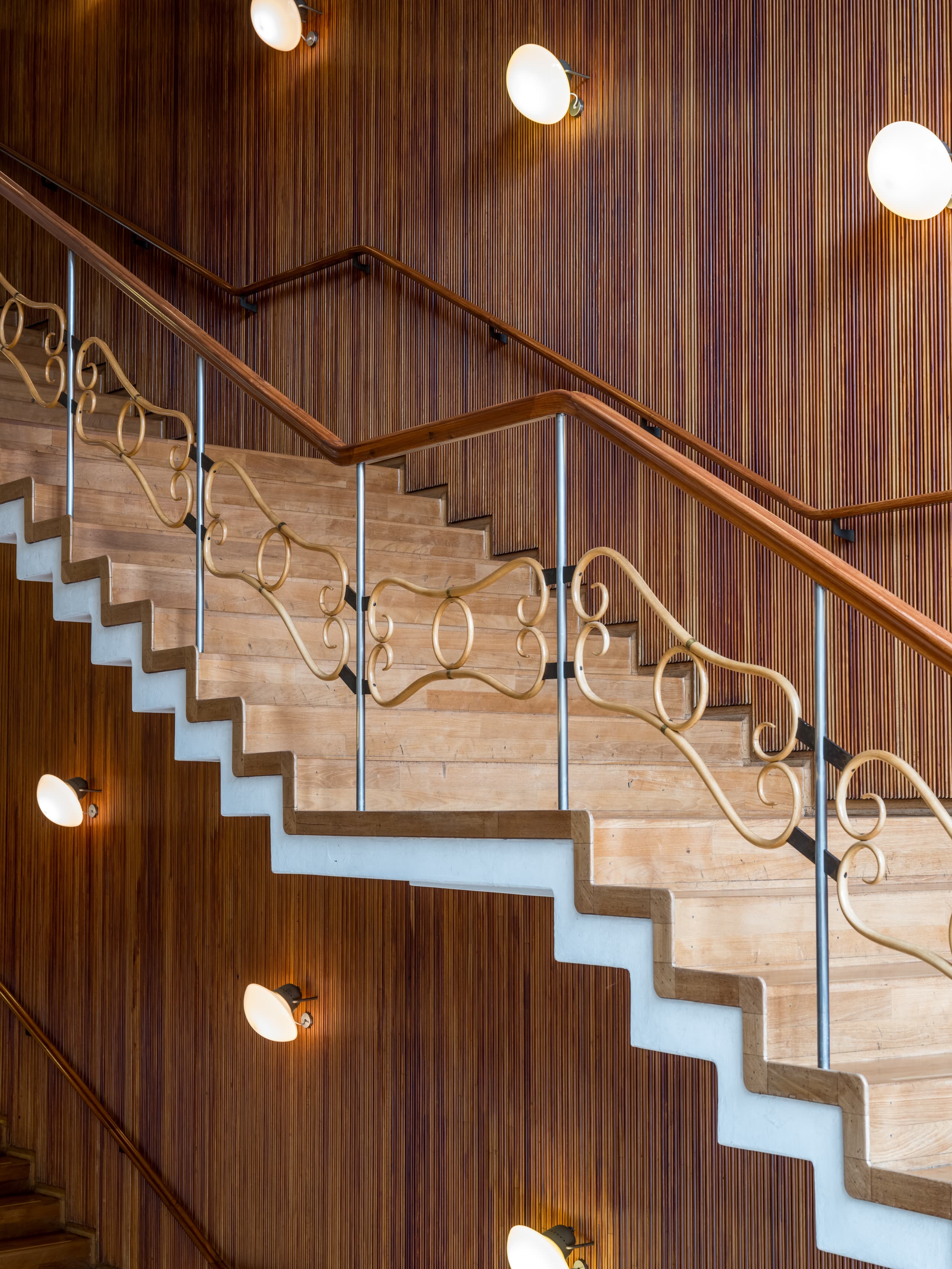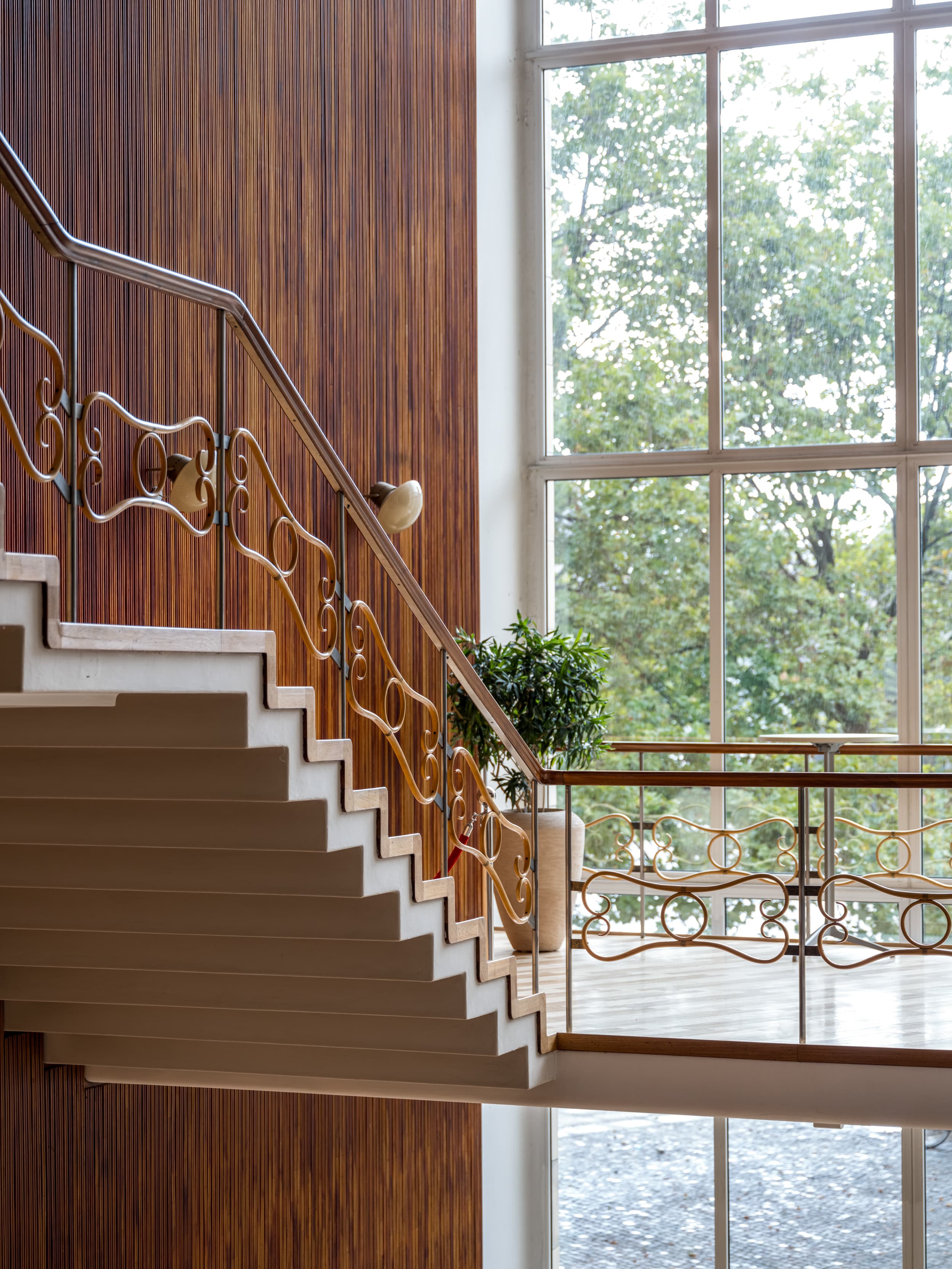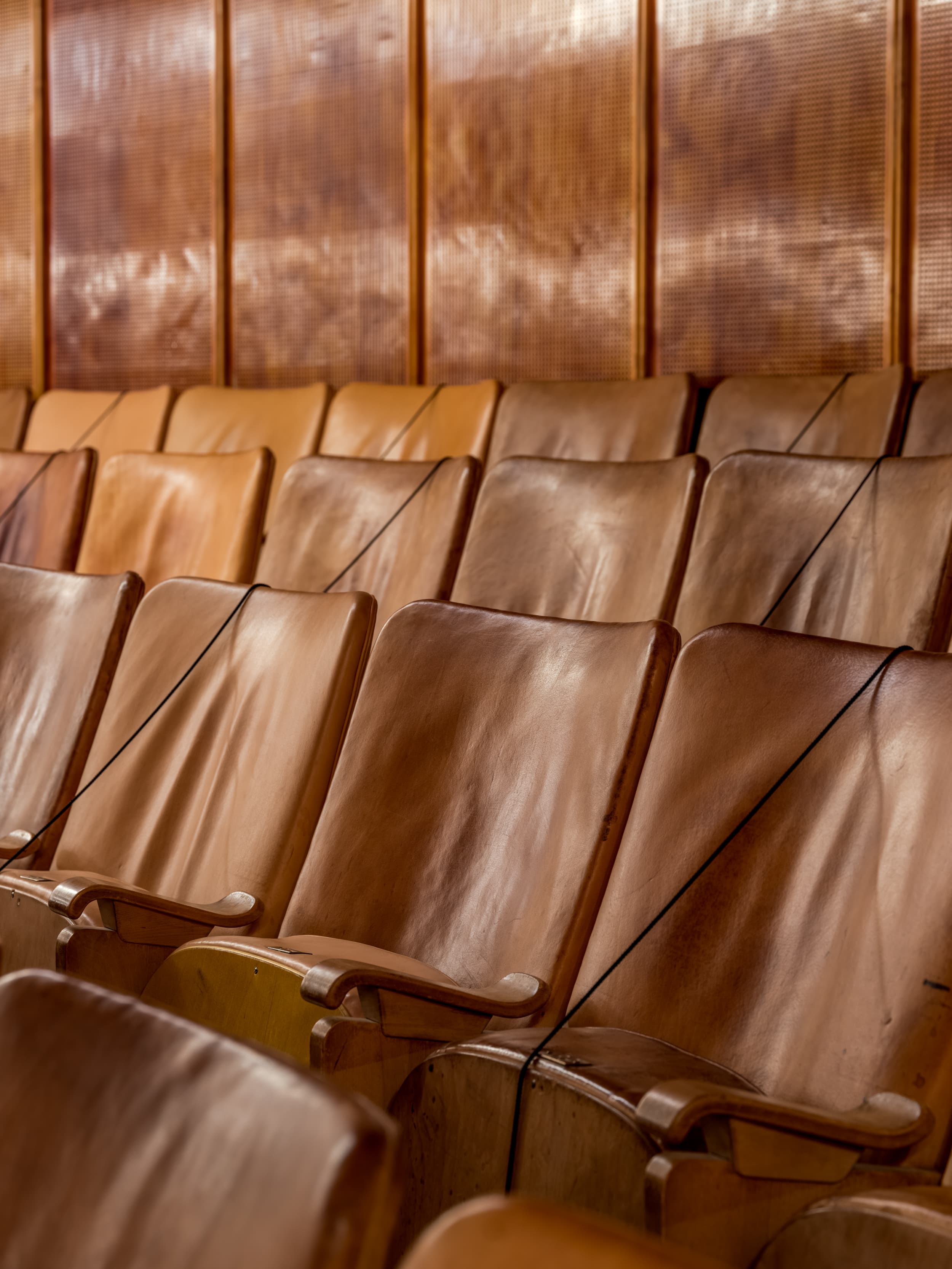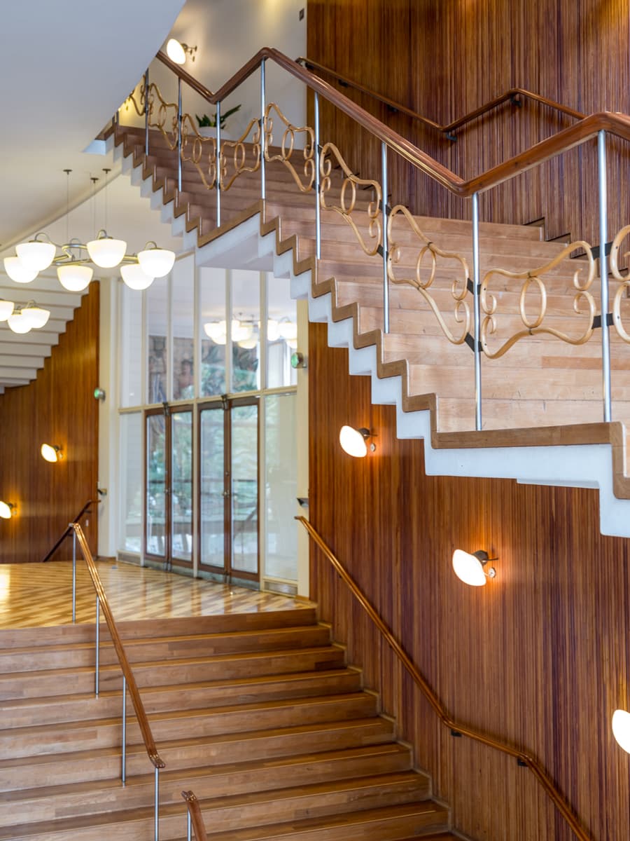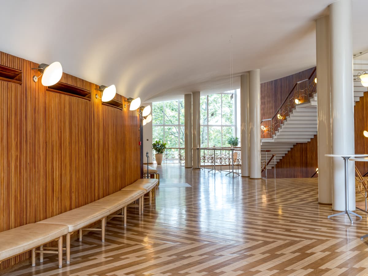 Bygningens snusfornuftige tilsnit opblødes af sanselige materialer, fra sandstensfacader og grønlandsk marmor til teaktræ, messing og paneler i ahorntræ. Sidstnævnte var oprindeligt helt lyse, men med tiden har de fået en rødlig patina. Loftet i forhallen er oksehud opspændt direkte på mineraluld.