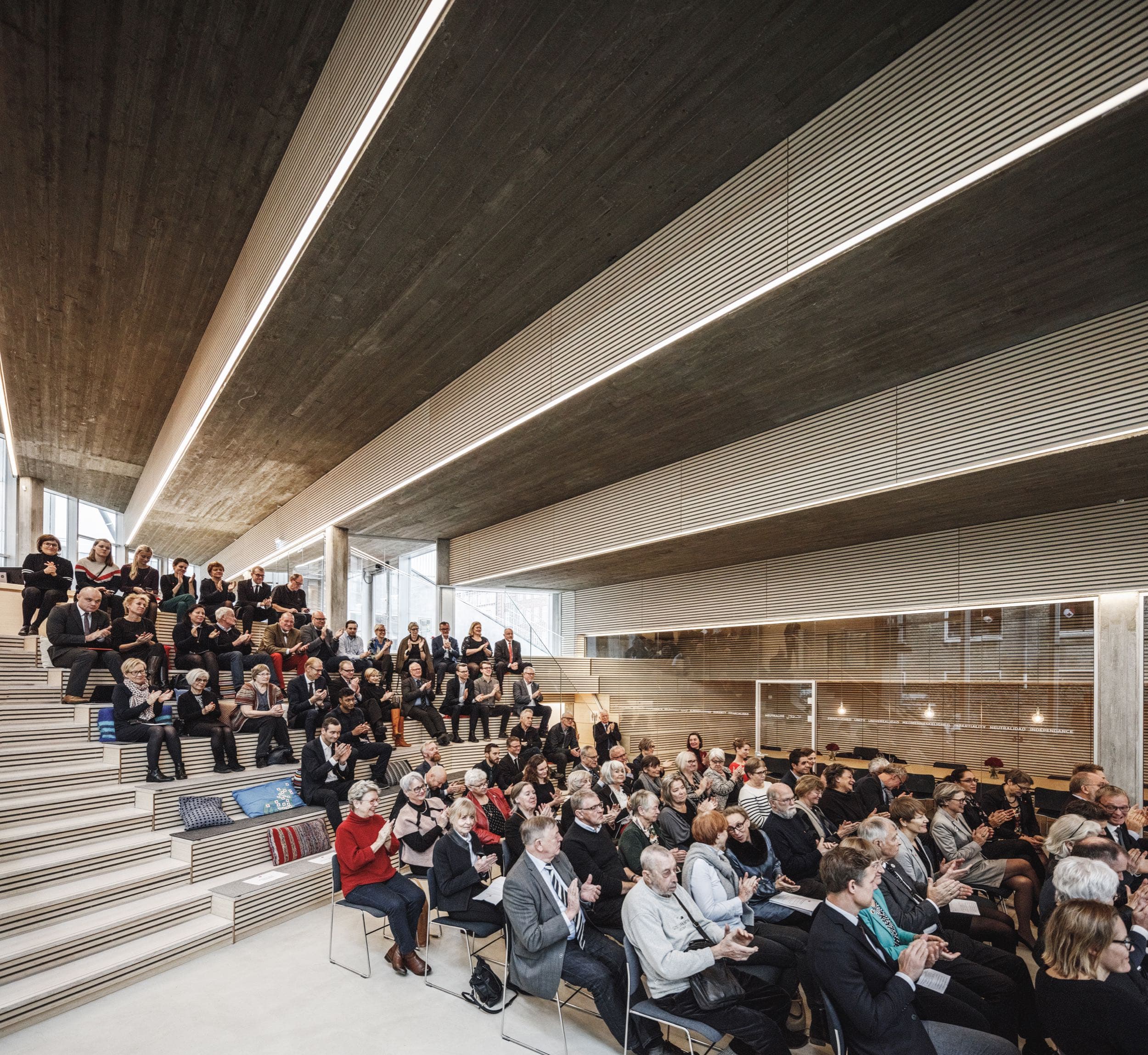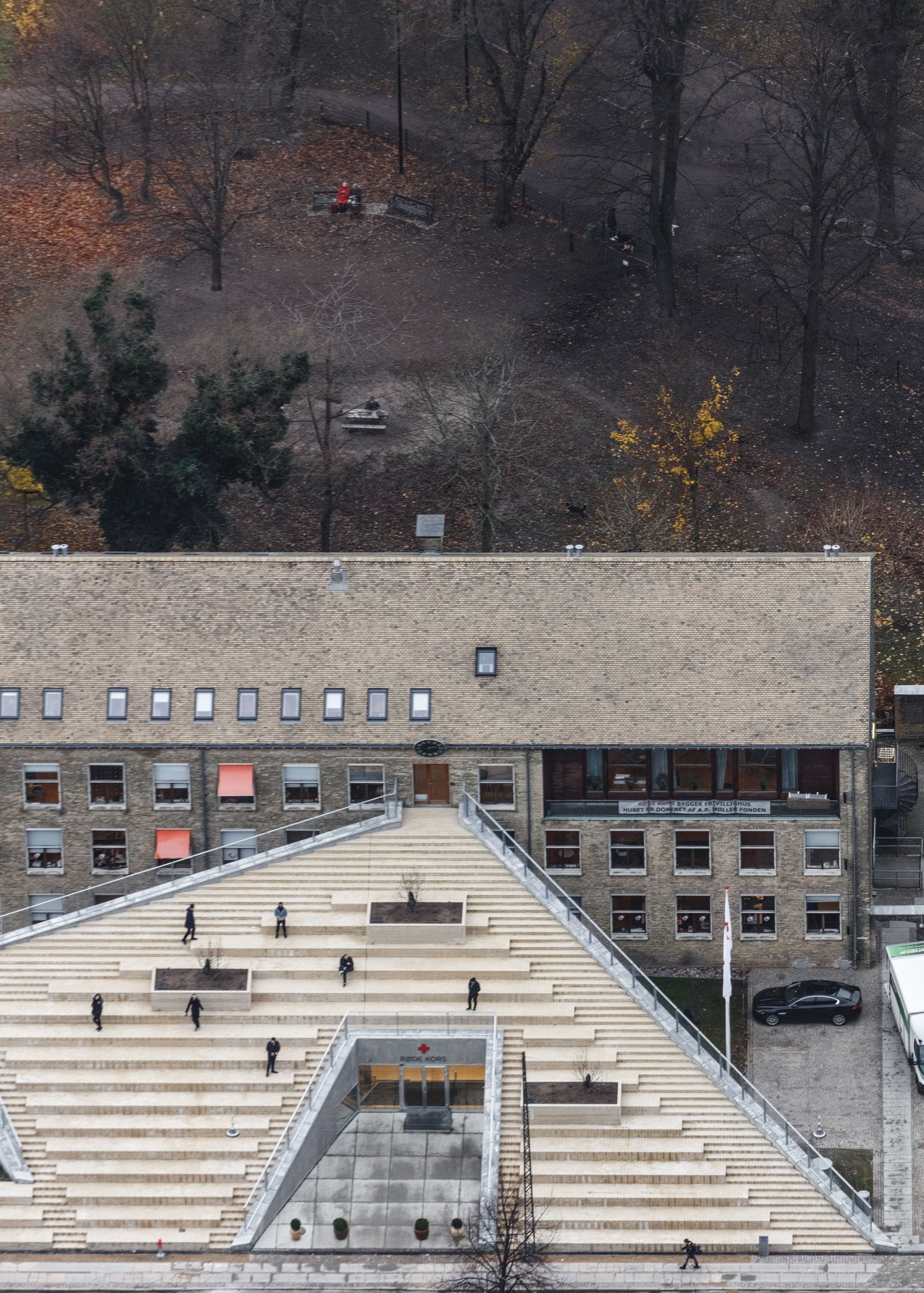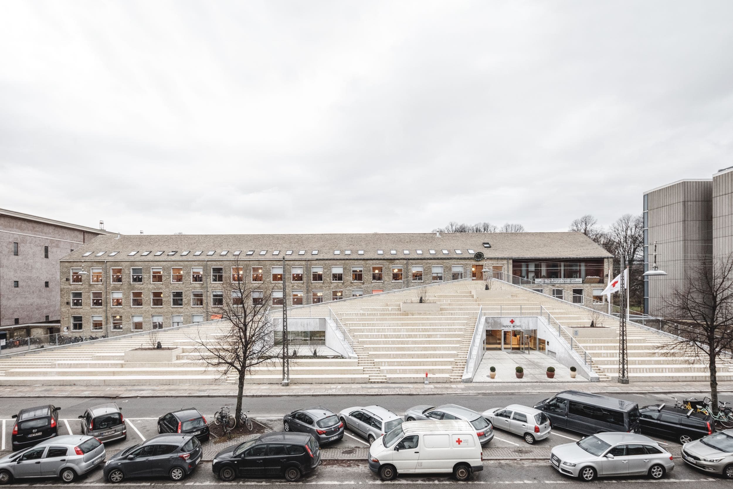 Egentlig udgør trappen også den ene væg og taget over en ny bygning til de frivillige i Røde Kors. Man bliver overrasket, når man går om bag trappen. Her kan man se direkte ind i store åbne varme rum gennem enorme vinduesfacader. Nysgerrige er velkomne indenfor til en snak og kan være heldige at møde en VR-fortælling, en udstilling eller en anden aktivitet.