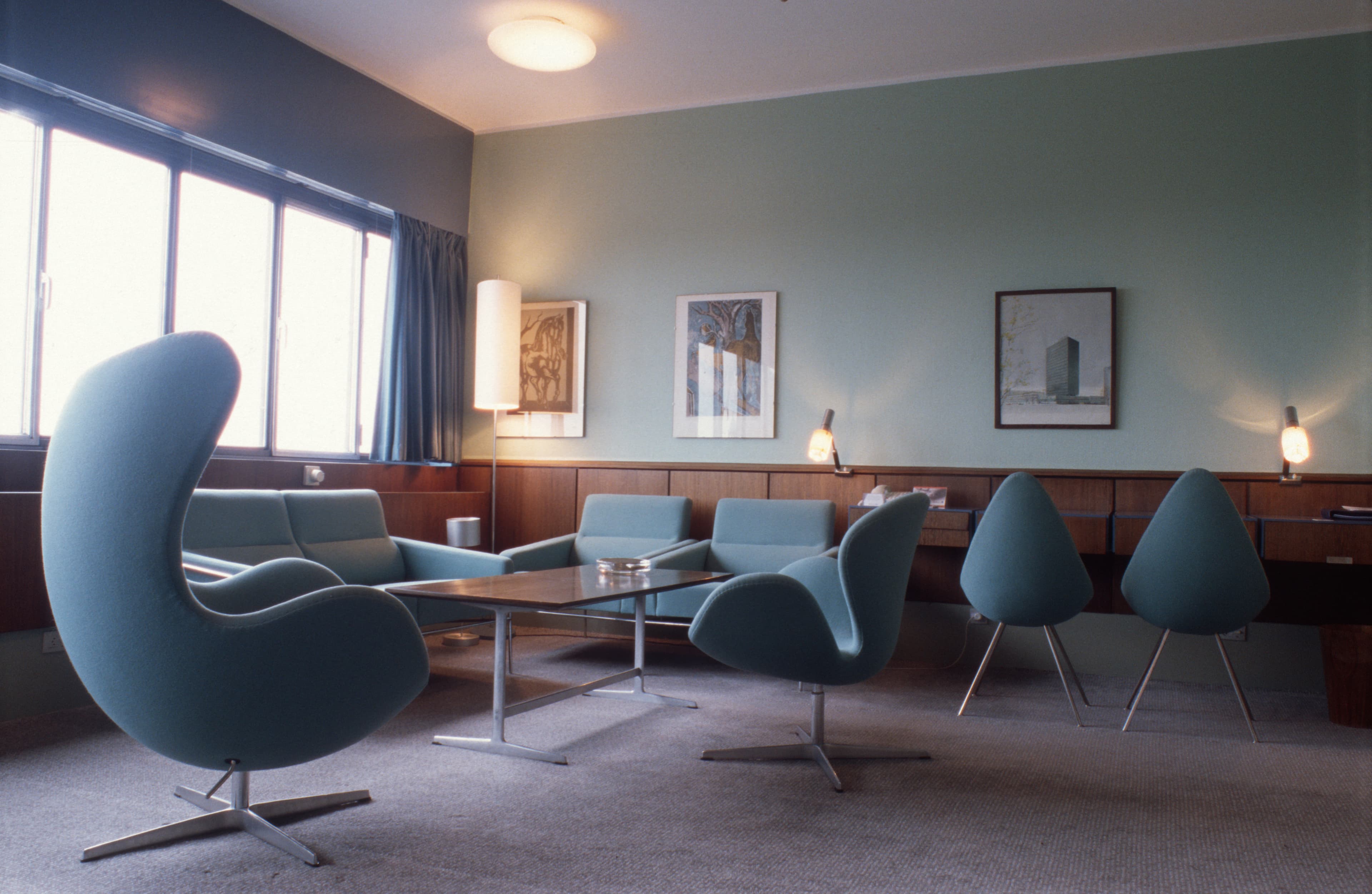 Arne Jacobsen designede hver en detalje: farver, møbler, dørhåndtag, lamper, bestik, askebægre og gardinkvaster. Alt! Lige bortset fra lyset i en del af foyeren, som blev kridhvidt af lysstofrør. Han brød sig ikke om det, men han bøjede sig, for hotellet var mere end et hotel. Det var en lufthavnsterminal for SAS-rejsende.