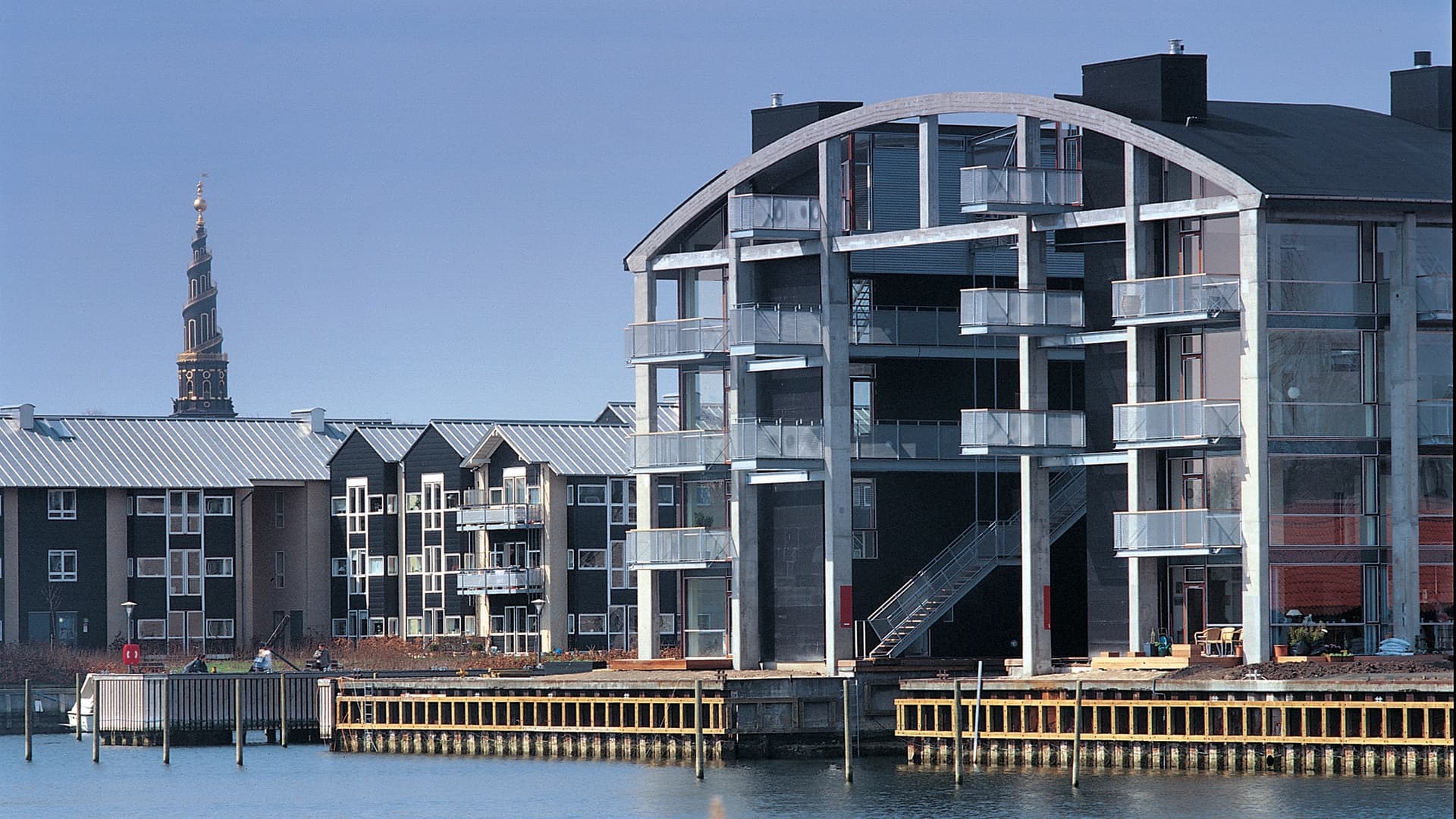 På Holmen i København har Tegnestuen Vandkunsten omskabt en gammel betonhal til luksuriøse ”lofts”. I komplekset har man indtænkt hallens oprindelige konstruktioner.