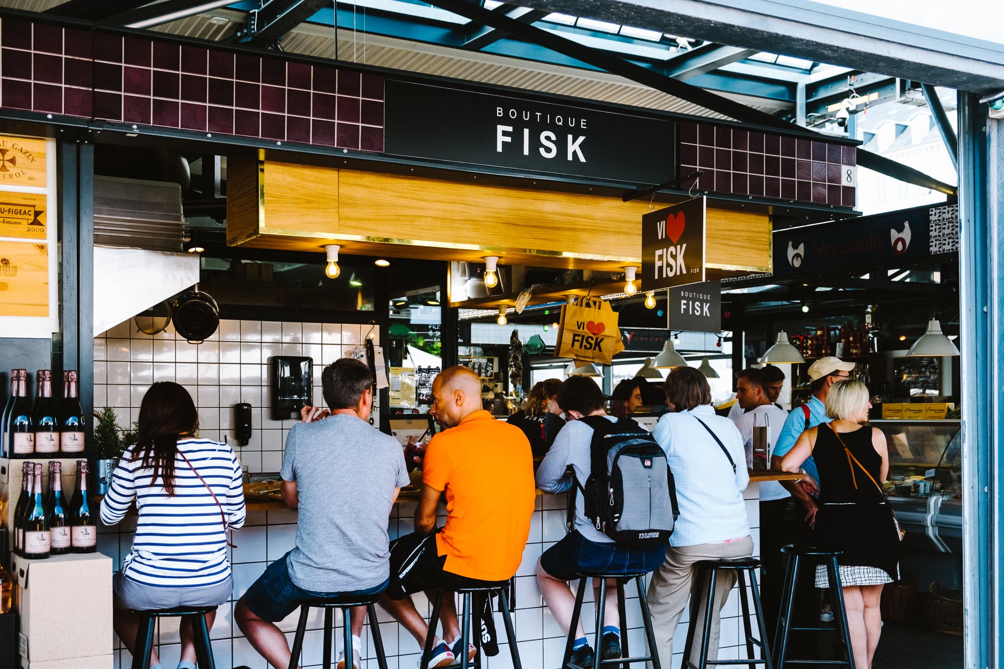 Især om sommeren er der liv ved hallerne med gæster, der nyder mad og drikke. Men netop overdækningen sørger for, at der hele året, uanset vejret, er grobund for ophold og plads til at handle eller slå sig ned og nyde lidt fra Københavns gastronomiske hylder.