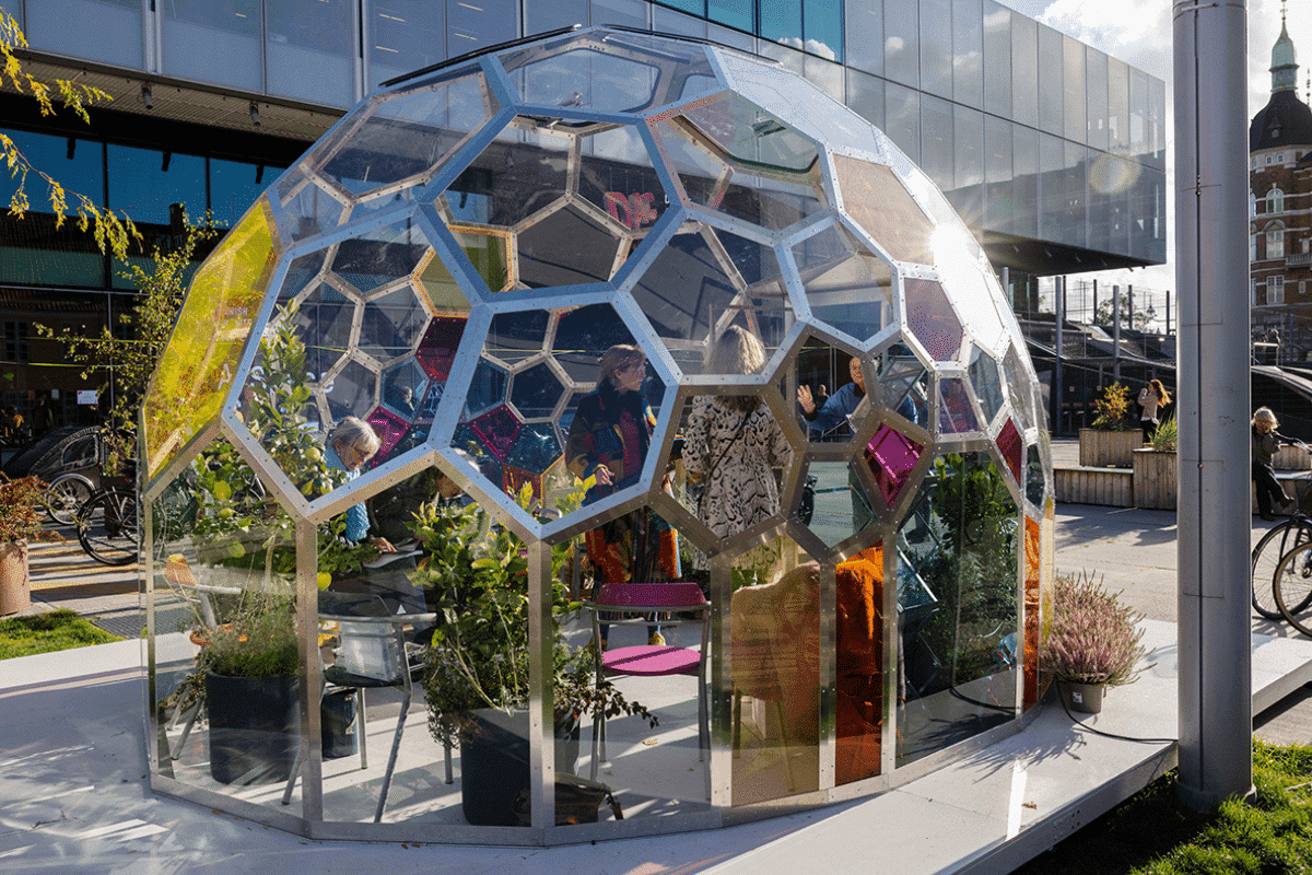 Det skulpturelle indslag skaber rammerne for et inkluderende rum, der opfordrer til ophold, ro og samvær. Glasfacaden gør kuplen til et inviterende sted, som samtidig lader naturen træde indenfor.