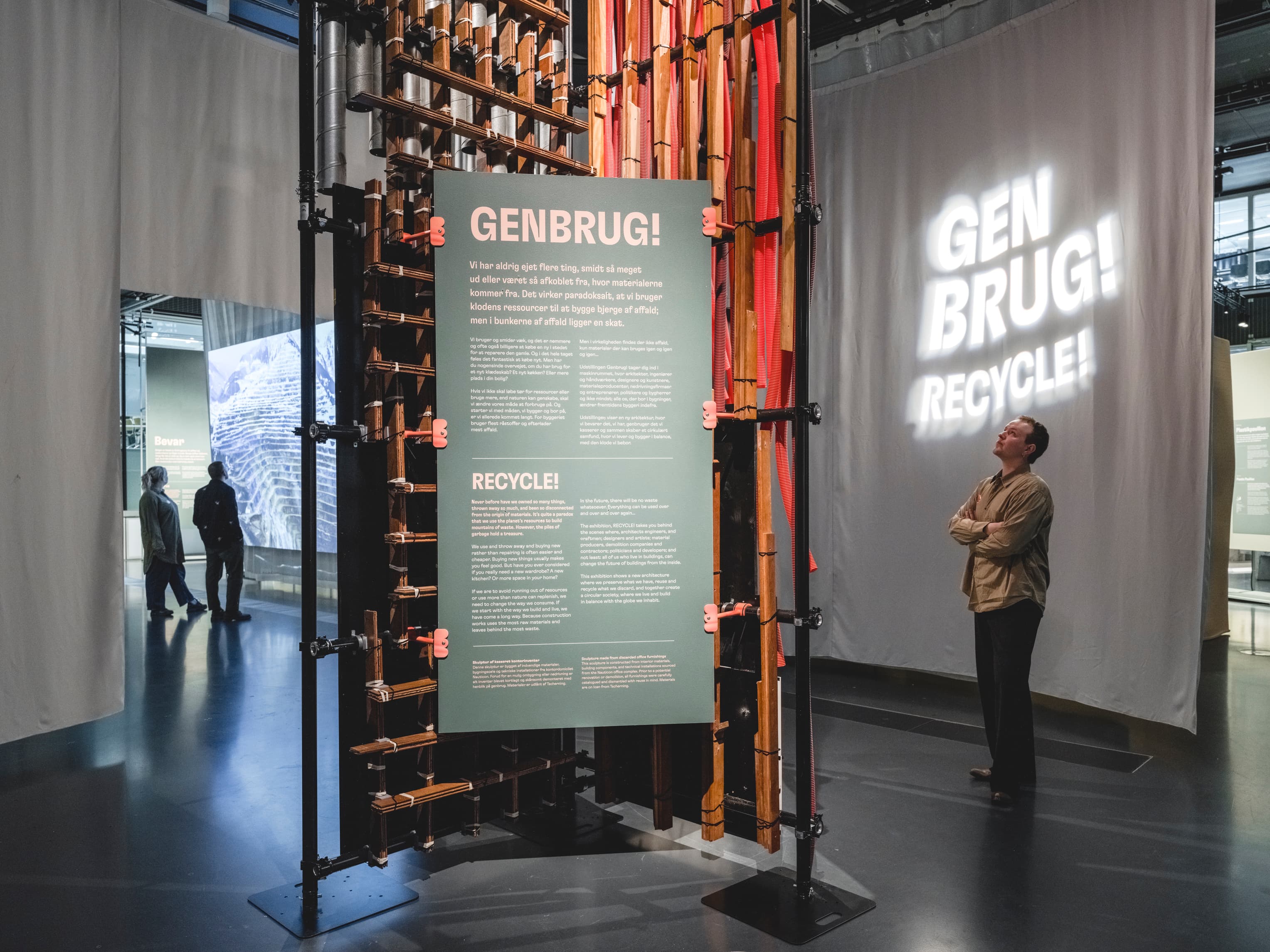“Vi er nødt til at gøre op med idéen om, at nyt altid er bedre. Byggesektoren er en af verdens største forbrugere af råstoffer, og samtidig en af de største producenter af affald. Det handler om at passe på det, vi allerede har skabt, genfinde værdien i det vi plejer at smide ud og bruge det – igen og igen. Det handler ikke om at give afkald, men om at skabe på en ny måde, at begynde at holde af ting på en anden måde, og måske endda foretrække ting man ellers ville have overset eller afvist”, siger seniorkurator Victoria Diemer Bennetzen, der er hovedansvarlig for udstillingen Genbrug!