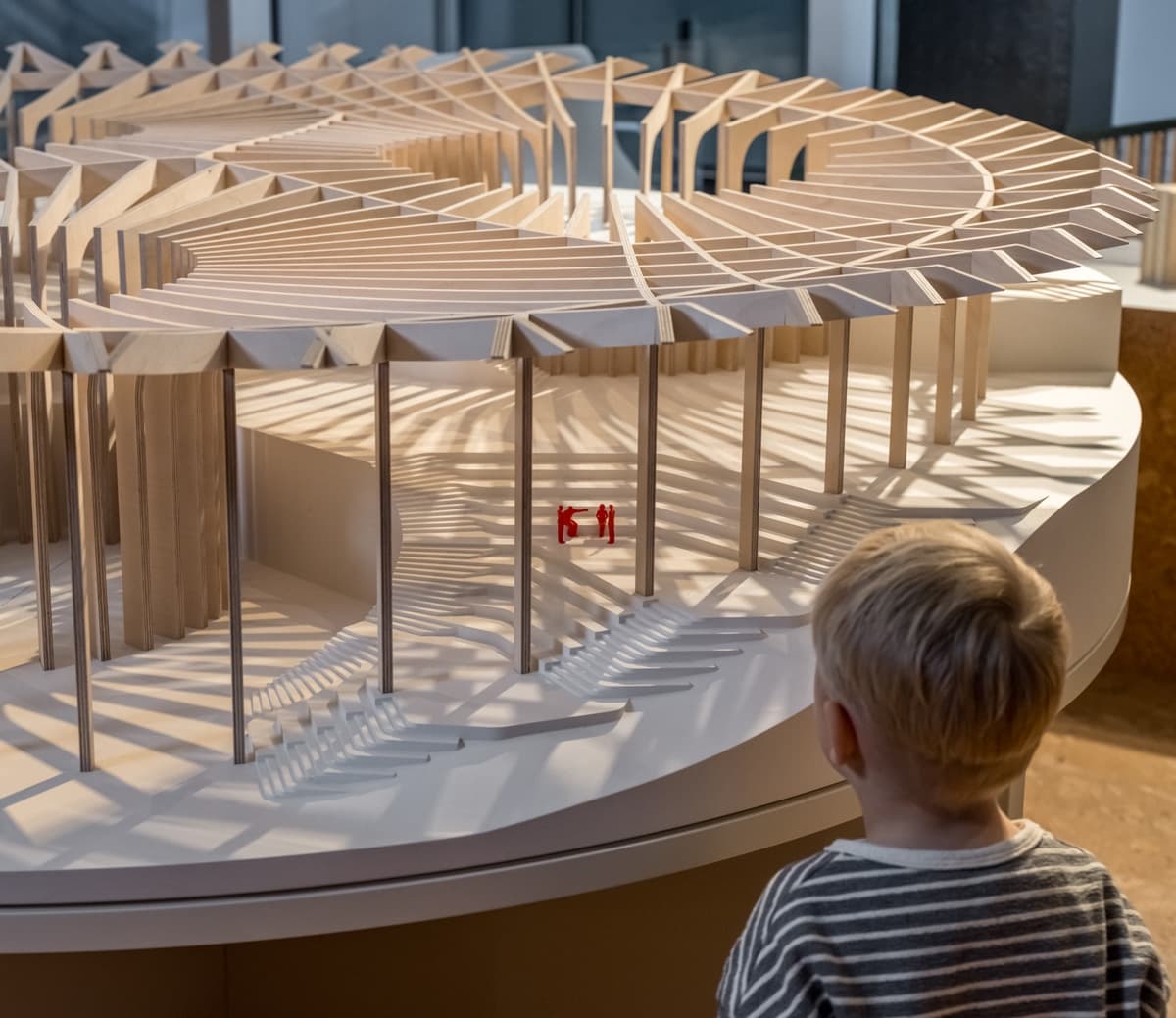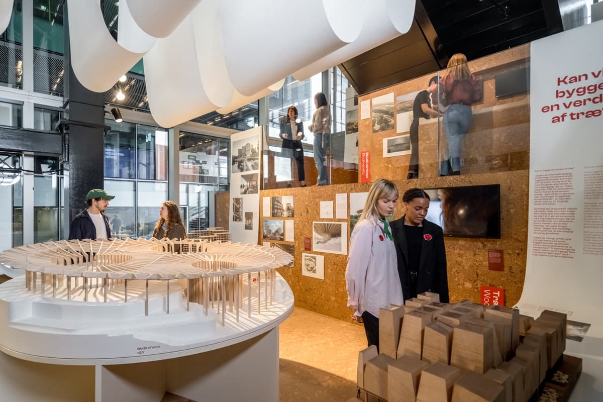 Træd ind i trappegalleriet og udforsk blandt andet, hvor meget CO2, de forskellige materialer udleder, og hvordan ressourcer som hø, blomster og træ kommer til at fylde på rejsen mod en mere grøn bygget verden med plads til alle levende arter.