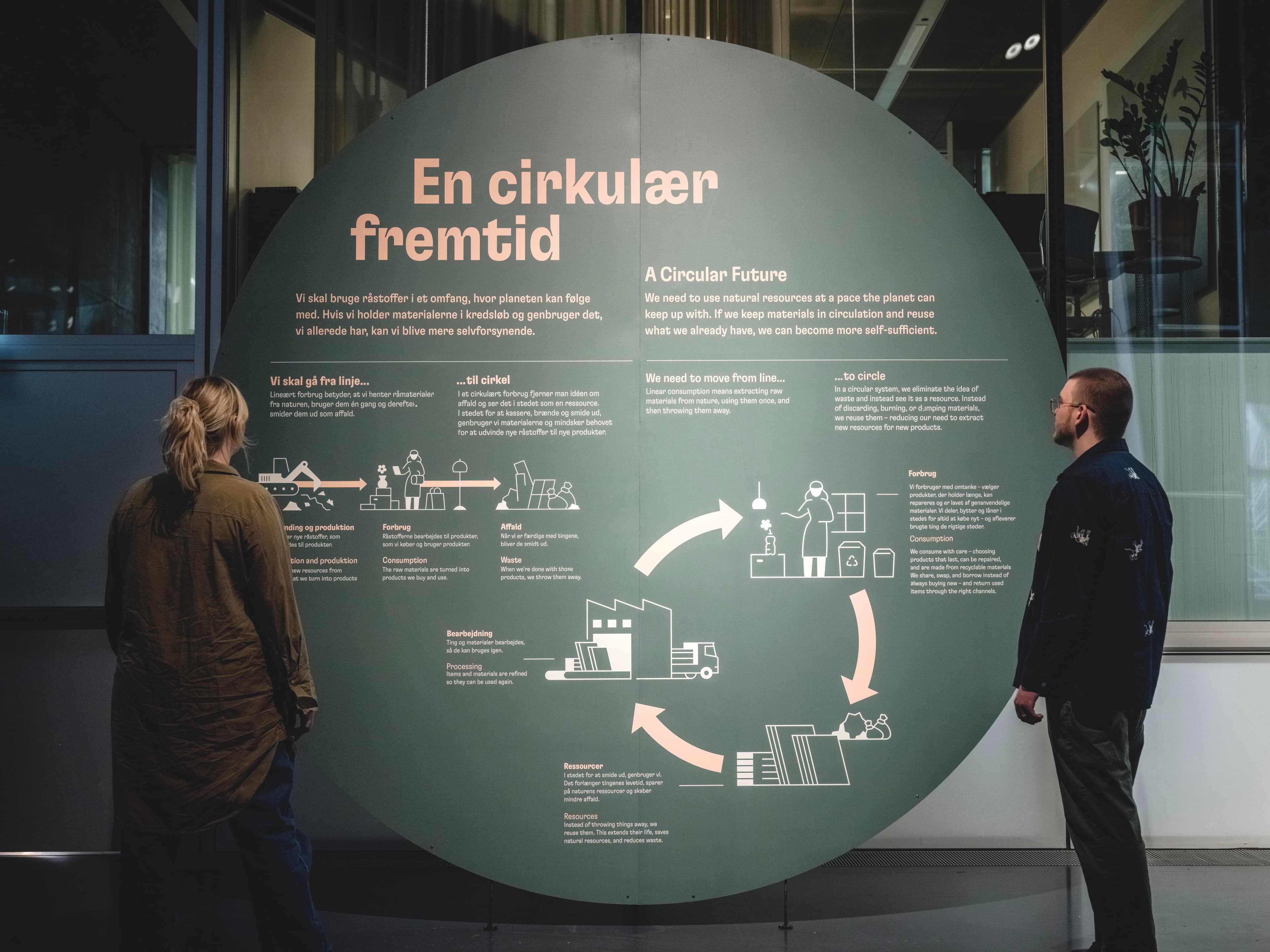 Udstillingen Genbrug! var et konkret eksempel på cirkulær udstillingspraksis. Alt – ned til mindste skrue – var registreret, så det kunne spores og bruges igen. Scenografien var skabt af materialer fra tidligere udstillinger i DAC, og både madrasser, podier og skilte havde fået nyt liv. Selv en installation fra den tidligere udstilling Vandet kommer var blevet forvandlet til et poetisk pauserum.