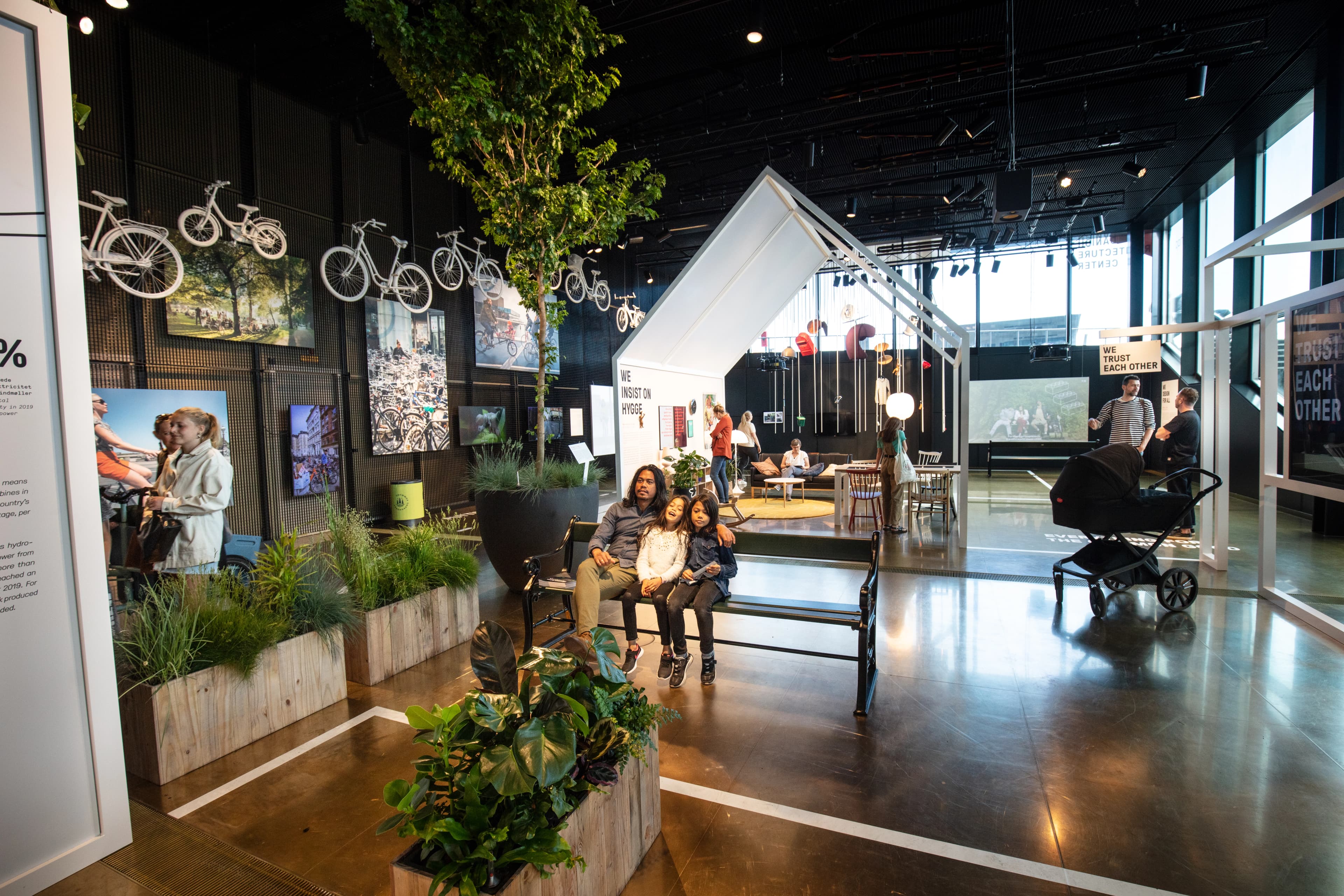 I udstillingen kunne du opleve seks installationer, der hver især repræsenterede et element fra hverdagen, som vi danskere værdsætter højt: Vores forhold til natur, den grundlæggende tillid vi har til hinanden, en insisteren på hygge, vores unikke cykelkultur, gennemtænkt design og vores glæde ved at være i nærheden af vand.