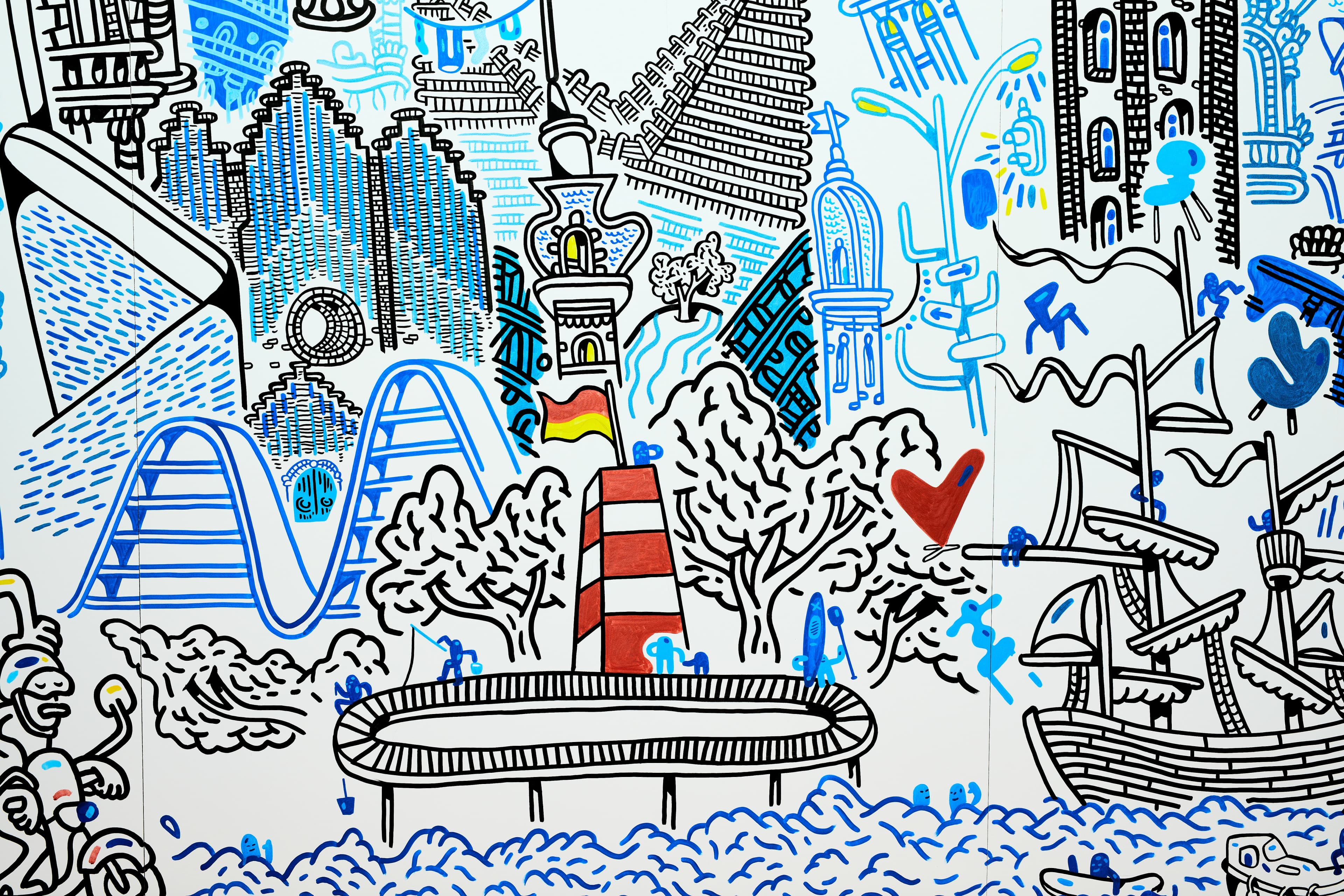 Til sidst i udstillingen kunne du more dig med at lave en souvenir foran vores fotovæg. Fotovæggen var tegnet af kunstneren Mormor og var en stor kærlighedserklæring til byen. Mormors værk rummede en masse arkitektur og andre elementer fra udstillingen og fra Danmark generelt.