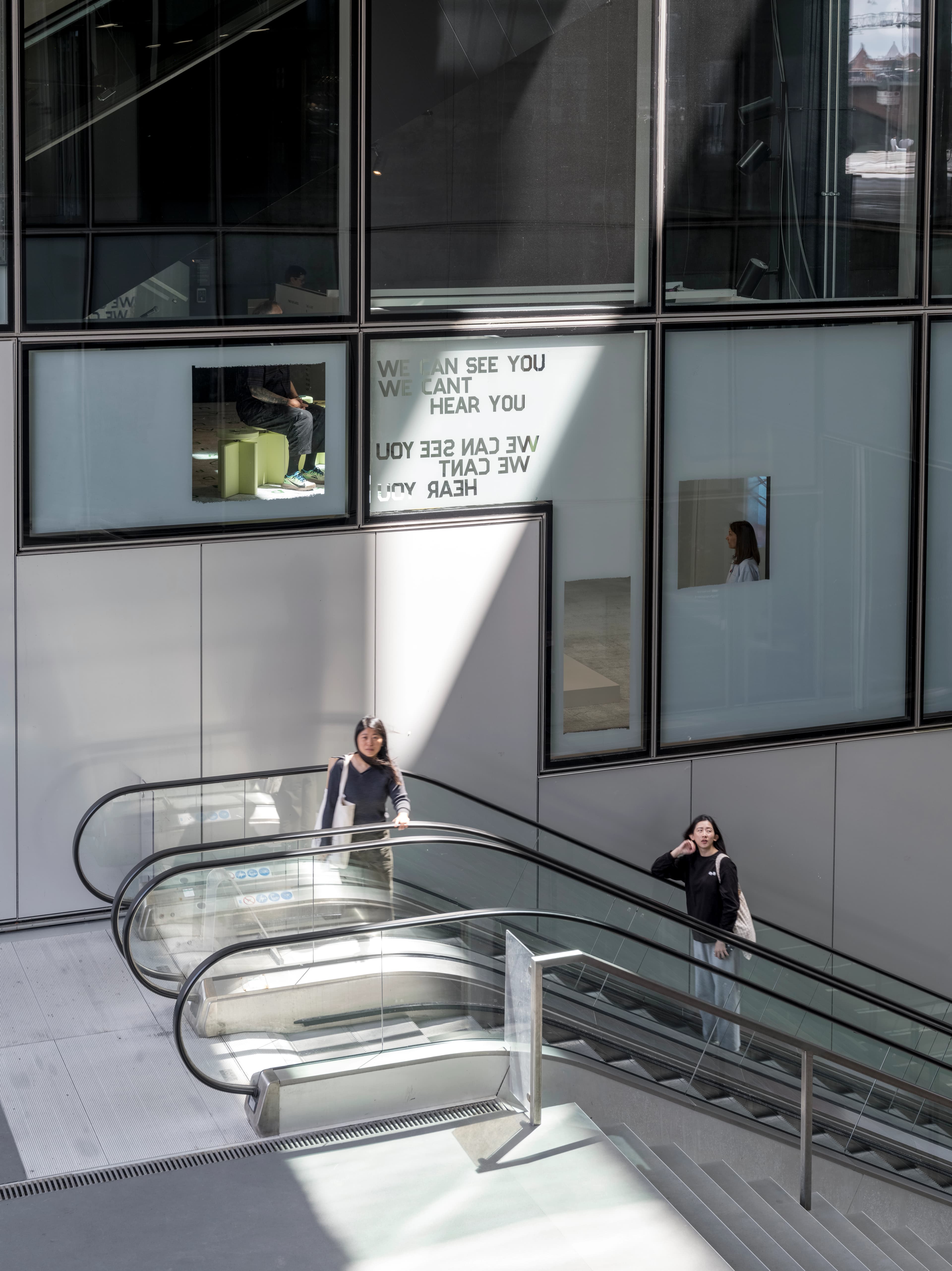 I udstillingen Meet Me Here blev DAC’s trappegalleri forvandlet til en levende installation. Her blev du inviteret til at være til stede – ikke kun online, men med hele din krop og opmærksomhed. Det digitale og det fysiske smeltede sammen i ét rum, hvor sanserne blev aktiveret, mennesker krydsede hinandens veje og uventede øjeblikke opstod. Det var en mulighed for at genopdage det at være til stede – i nuet og med hinanden.