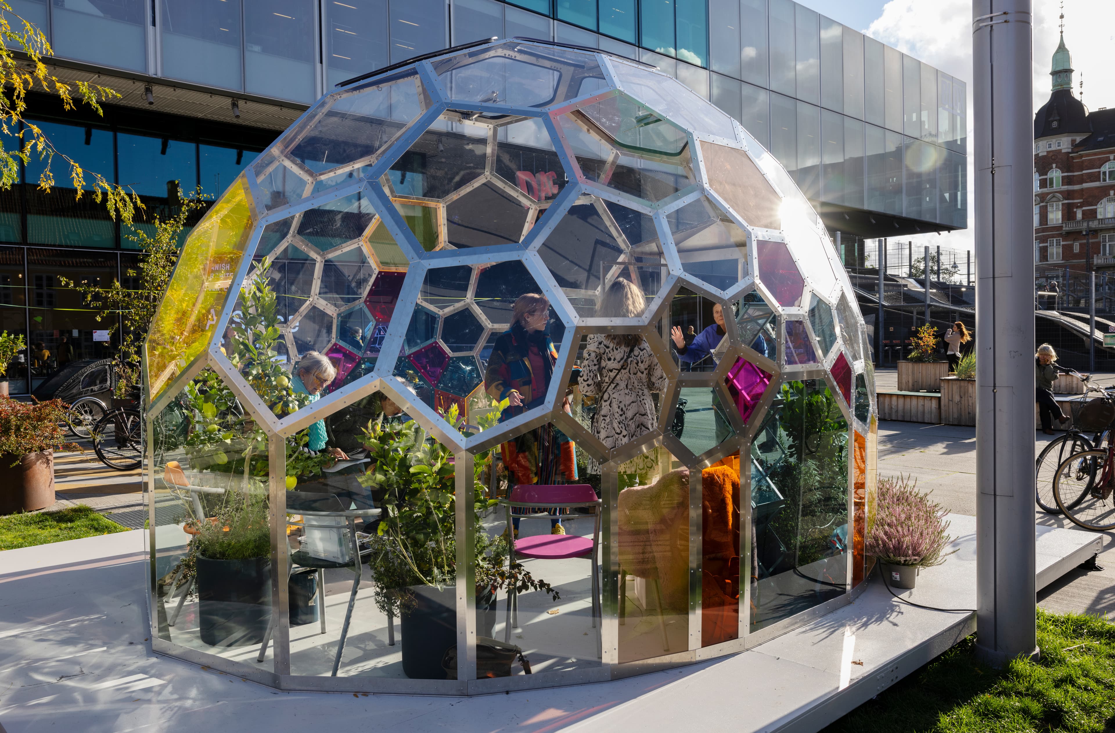 Allerede efter første øjekast er man ikke i tvivl om, at Njord kuppel er inspirerede af naturen. Et arkitektonisk drivhus skabt af sekskantede vinduer, der blandt andet skaber klare referencer til en bikube. Det skulpturelle indslag er designet af den danske virksomhed Njord, som også opfordrer til ophold, ro og samvær. Glasfacaden gør kuplen til et inviterende sted, der samtidigt lader naturen træde indenfor.