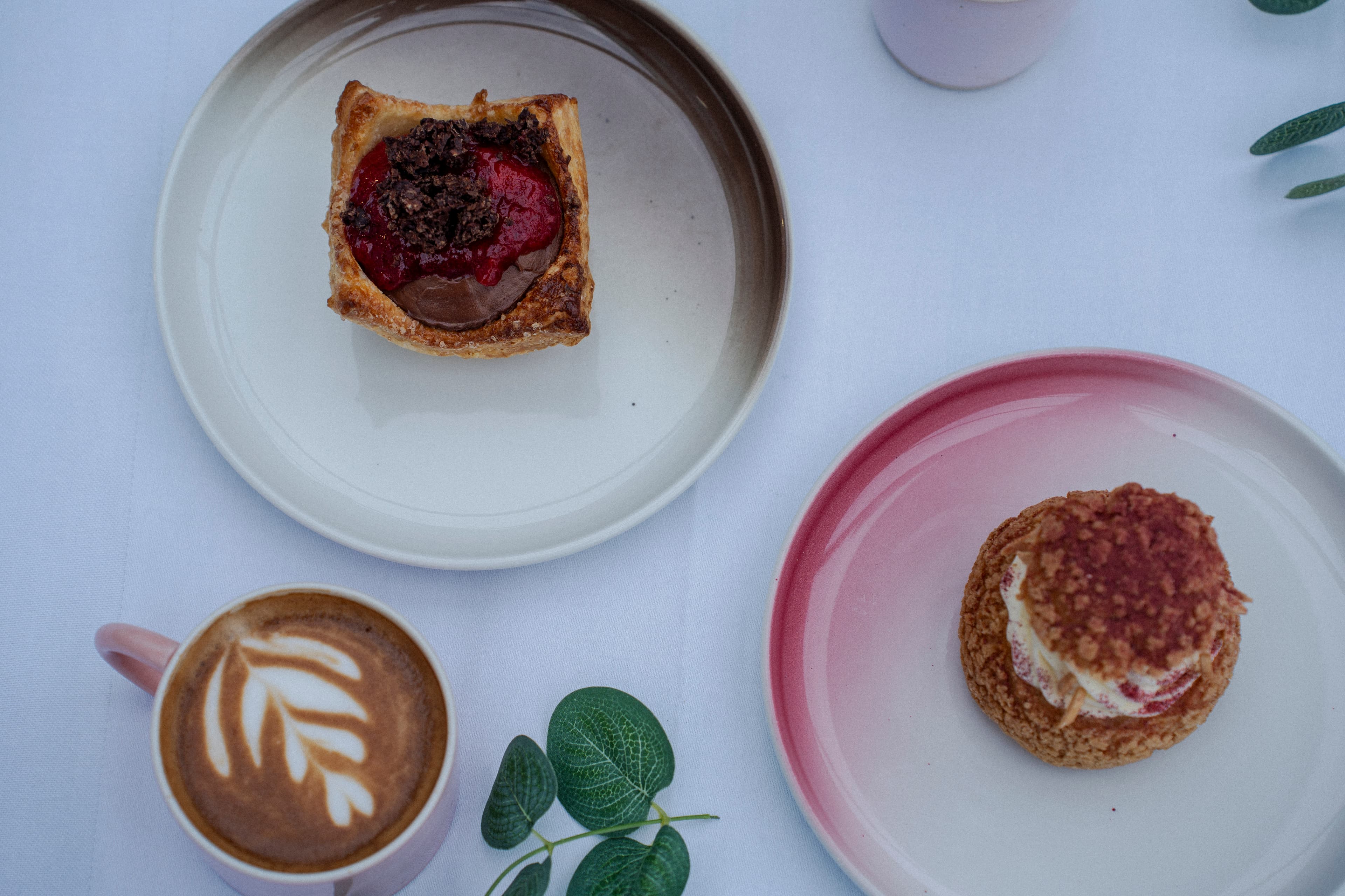 Prøv vores to fastelavnsboller. Den ene består af en butterdejsskal med chokolade crémeux, blomme i Madeira, pistacie og kaffeknas og den anden består af en lækker sprød vandbakkelse med mascarponecreme, syltede solbær, mandler og saltet karamel.