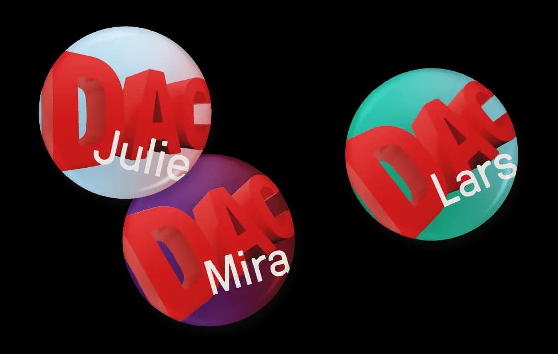 Resultatet blev et knaldrødt DAC logo, der som en superhelt flyver igennem byen og vil åbne alles øjne for arkitektur. Bogstaverne er overdimensionerede, farveuniverset er vildt og vidtfavnende, og design-implementeringen på print og web bryder med designpolitiets konventioner. Og når DAC står stille, er det ikke et fladt logo, men en 3D-figur, som kalder på interaktion med omverdenen.