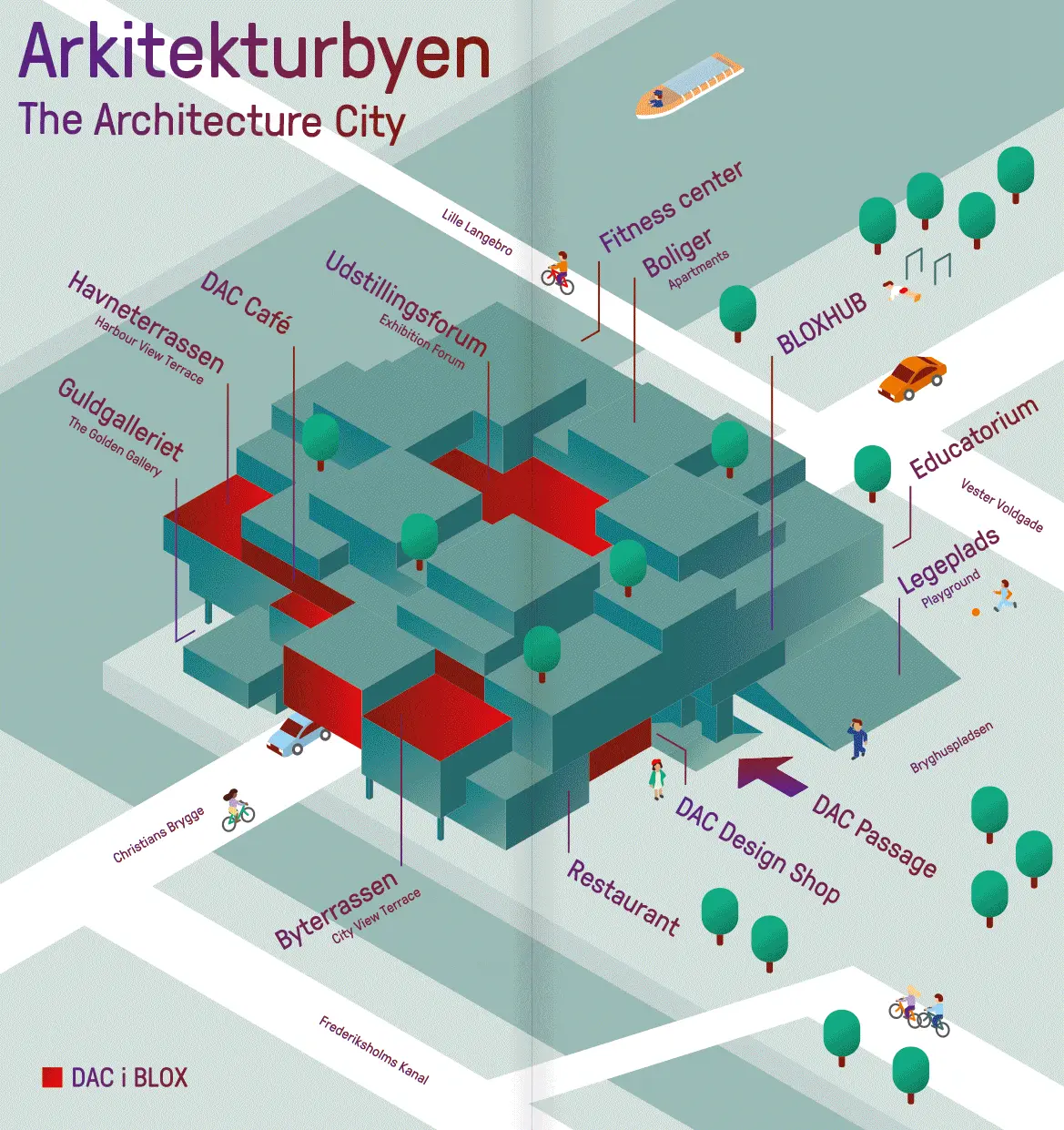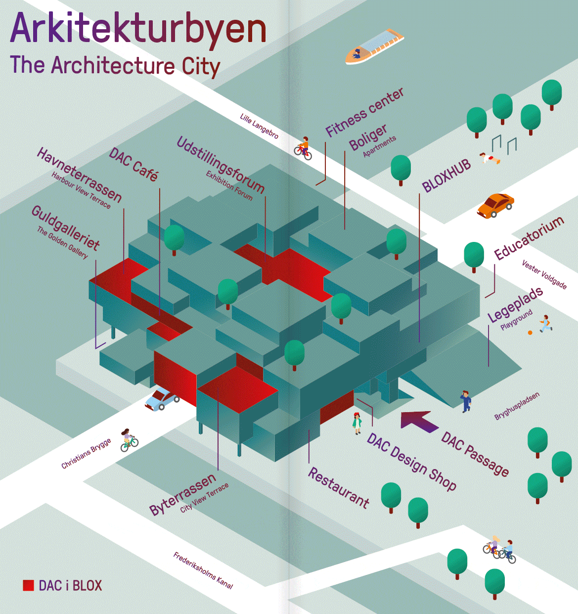 Din oplevelse af arkitekturbyen ville naturligvis starte hos DAC. Her oplever du BLOX, som i sin multifunktionelle form er en lille arkitekturby i sig selv, og du kan med DACs guider gå på opdagelse i arkitekturbyen udenfor eller lære mere om den og andre arkitekturbyer igennem talks, workshops, events m.m.